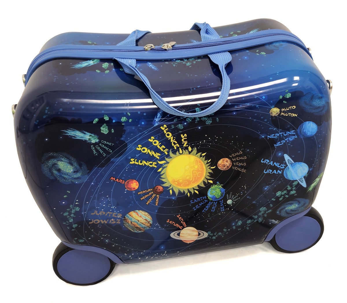 Urocza, pojemna walizka na kółkach z motywem kosmosu, która z pewnością przypadnie do gustu każdemu małemu podróżnikowi. Idealna na wycieczki czy wyjazdy urlopowe.