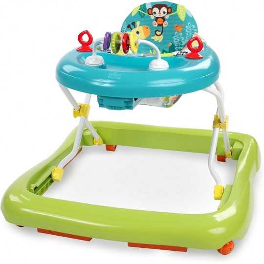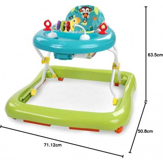 Zanim dziecko postawi pierwsze samodzielne kroki, może poznawać świat i znajdować nowe przygody z pomocą chodzika Giggling Safari. Blat wyposażony jest w zabawki pomagające rozwijać zdolności motoryczne dziecka. Wysokie oparcie zapewnia dodatkowe wsparcie dla dziecka. Chodzik można regulować w 3 pozycjach wysokości, aby dostosować go do wzrostu dziecka, posiada również gumowe kółka.