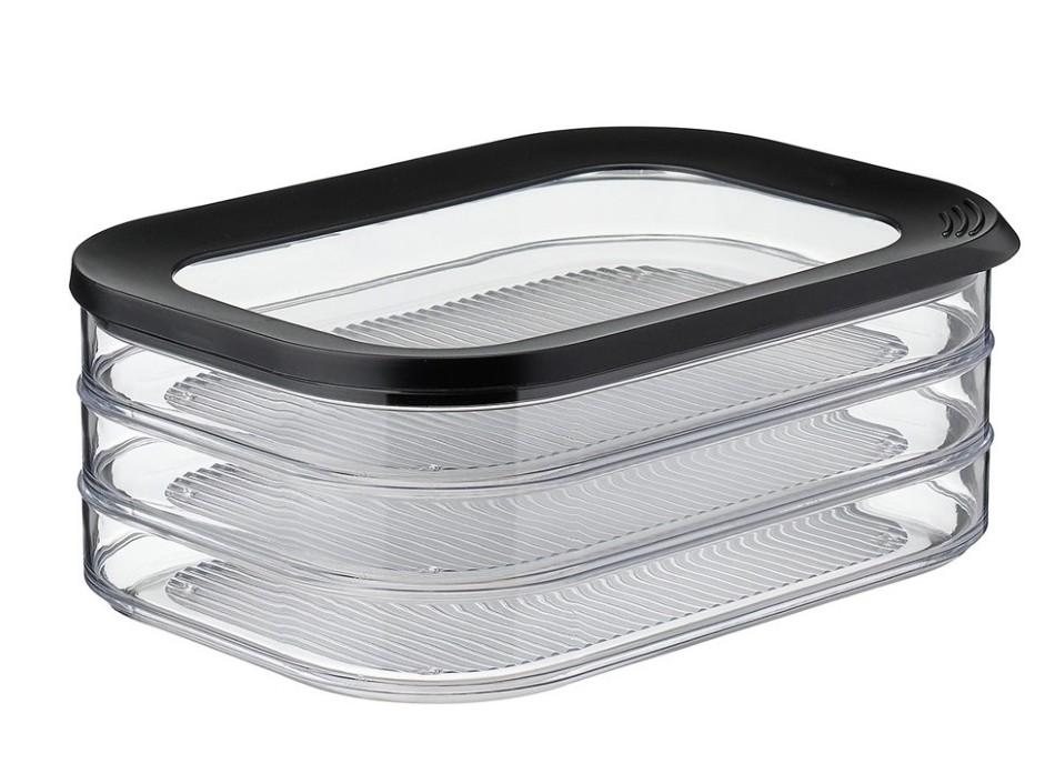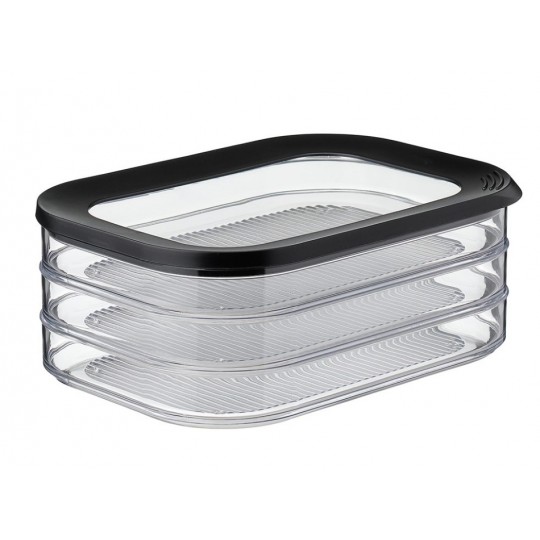 Nowoczesny i praktyczny pojemnik na wędliny holenderskiej marki Mepal. Przezroczysta pokrywa umożliwia kontrolowanie zawartości bez potrzeby otwierania. Pojemnik składa się z 3 części o wysokości 2,5 cm a trzy poziomy pozwalają zaoszczędzić i zagospodarować miejsce w lodówce. Dolna część to profilowana i perforowana tacka, która separuje żywność od zbierającej się na dnie wilgoci, co sprzyja przedłużeniu przydatności do spożycia przechowywanych produktów oraz ułatwia ich wyciąganie. Pojemnik jest higieniczny i łatwy w czyszczeniu, szczelny - co zapobiega rozproszeniu zapachów na inne artykuły spożywcze. Produkt łączy nowoczesny design z praktycznym zastosowaniem. Pojemnik nadaje się do mycia w zmywarce. Wszystkie produkty Mepal wolne są od BPA oraz wykonane z materiałów nieszkodliwych dla zdrowia. Wyprodukowano w Holandii. Pojemniki Modula to idealne rozwiązanie dla osób ceniących sobie porządek, jakość i funkcjonalność w kuchni. Postaw na estetykę, świeżość i wygodę każdego dnia!