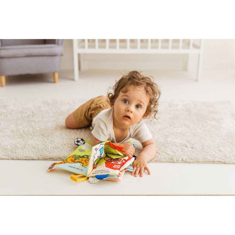 Wiejskie zwierzątka zapraszają maluszki do wspólnej zabawy w oglądanie obrazków i odkrywanie zróżnicowanych faktur materiałów! Książeczka wyposażona została w szeleszczącą okładkę i barwne strony, z których wystają różne, materiałowe elementy. Na poszczególnych stronach na najmłodszych czekają krótkie zdania w języku polskim, nawiązujące do obrazków. Praktyczna zawieszka pozwala przyczepić książeczkę w dowolnym miejscu, aby mogła towarzyszyć maluchowi podczas zabawy w domu, a także na spacerze. Produkt przeznaczony jest dla dzieci od dnia narodzin.