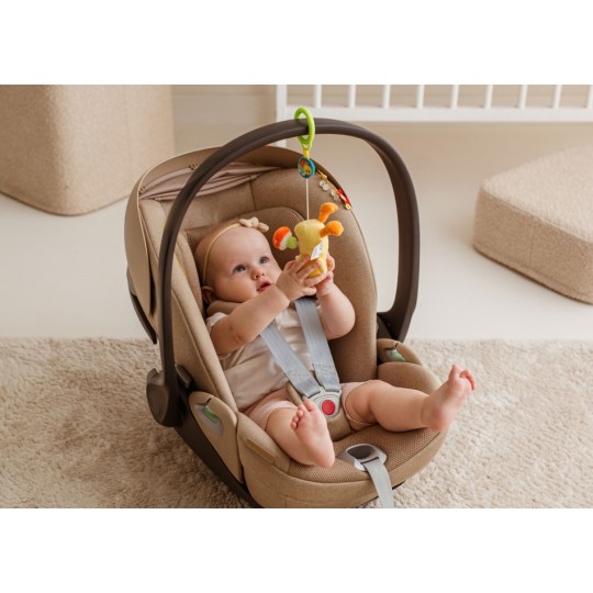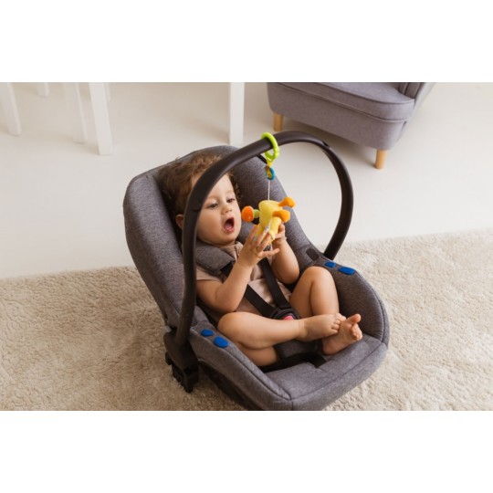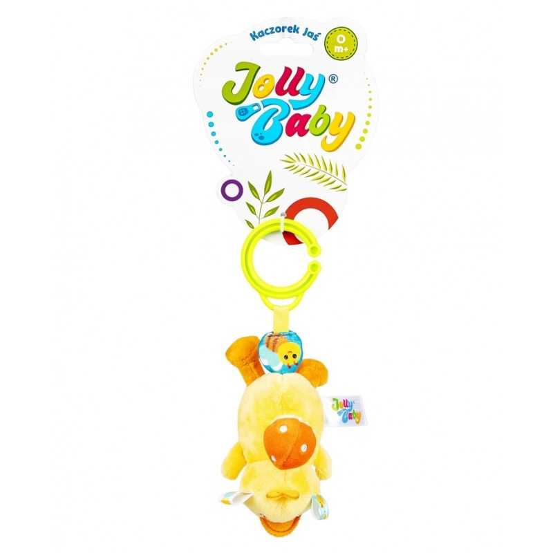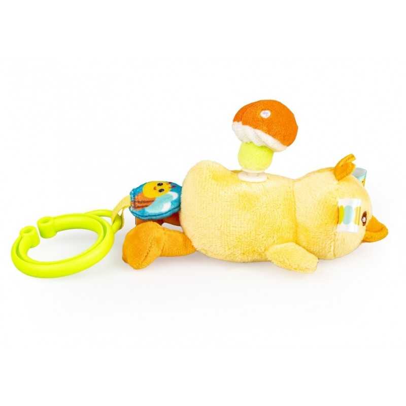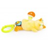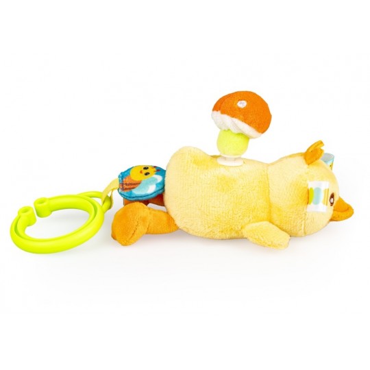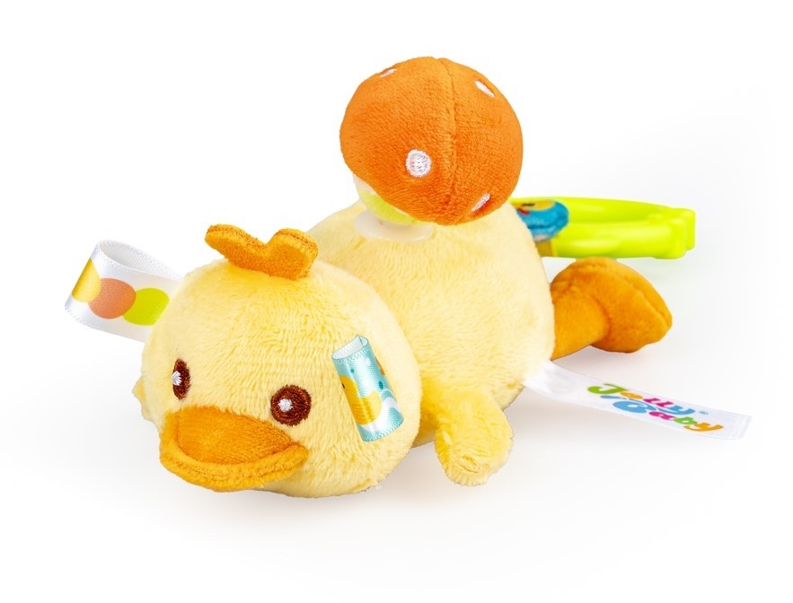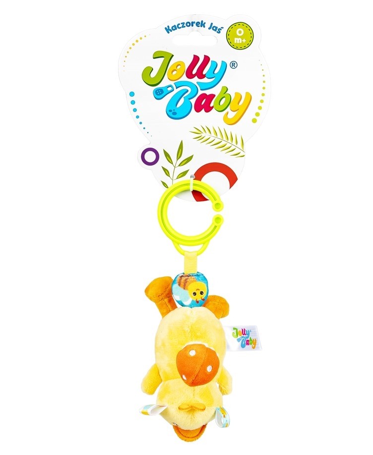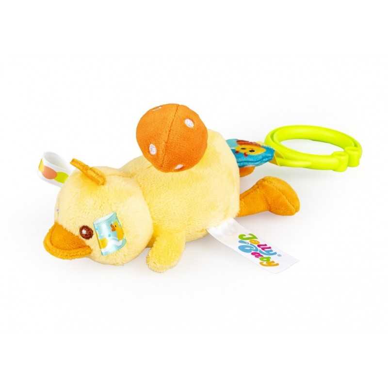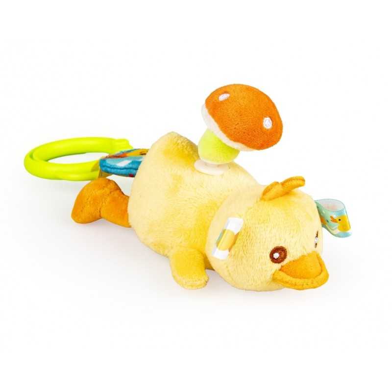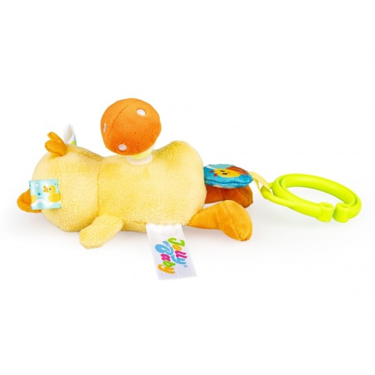 Zabawny kaczorek rozkręci super zabawę! W tym uroczym ptaszku kryje się dzwoneczek, który wydaje wesoły dźwięk przy potrząsaniu zabawką. Na grzbiecie kaczorka znajduje się pluszowy grzybek, który zakręci się wesoło, gdy tylko pociągniesz za kółeczko z pszczółką przy zawieszce lub za, przyczepionego wcześniej, Jasia. Kaczorek podciągnie się na tasiemce z powrotem do góry, wesoło przy tym wibrując. Zabawka wykonana została z materiałów o zróżnicowanych fakturach. Produkt przeznaczony jest dla dzieci od dnia narodzin.