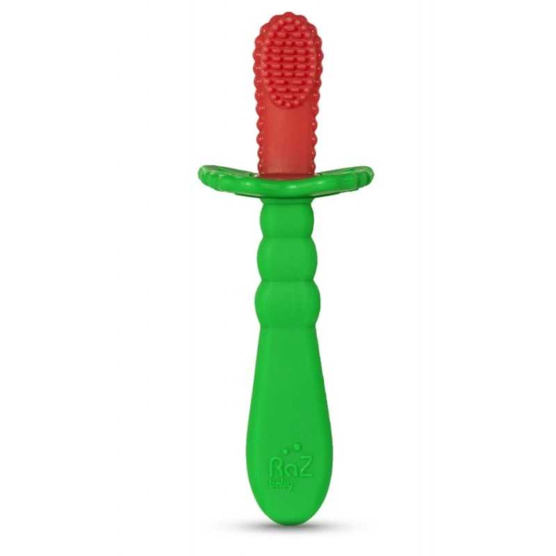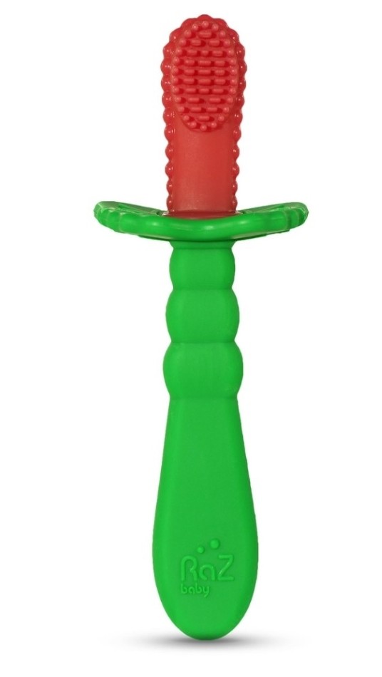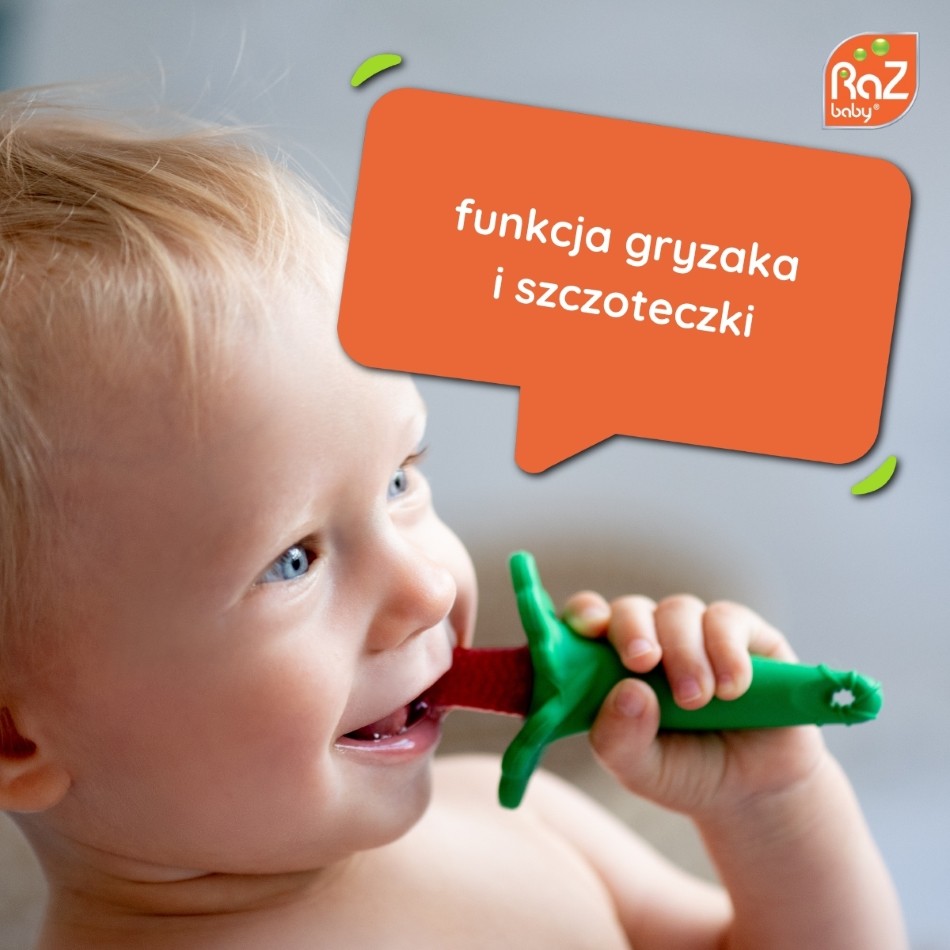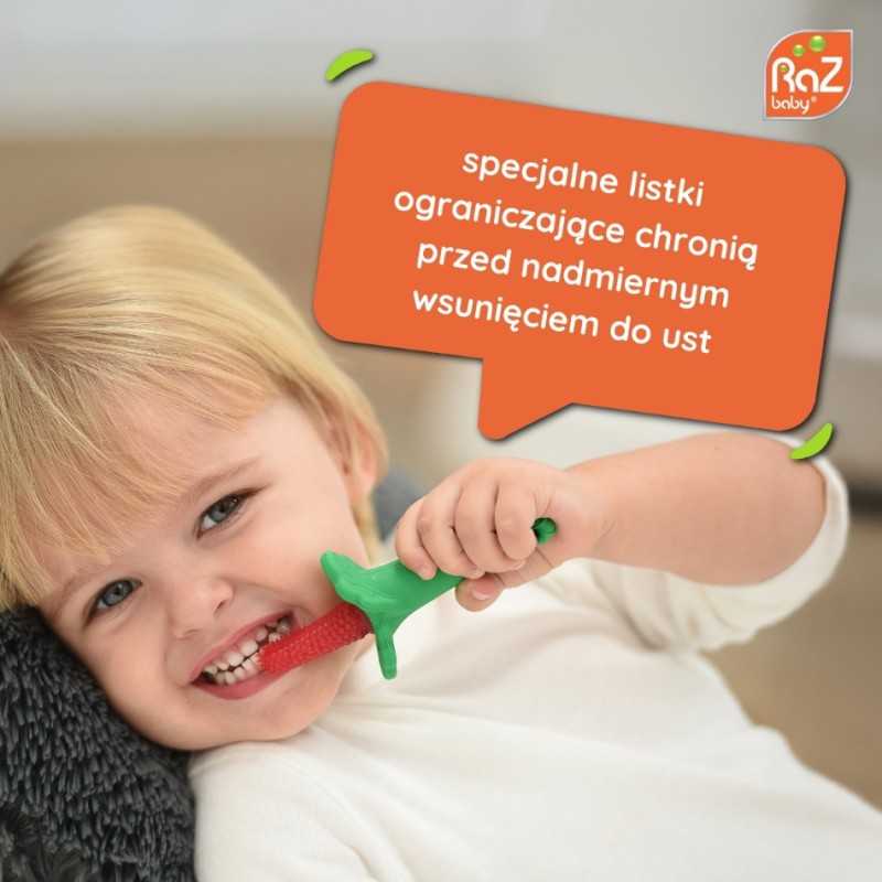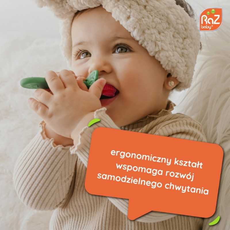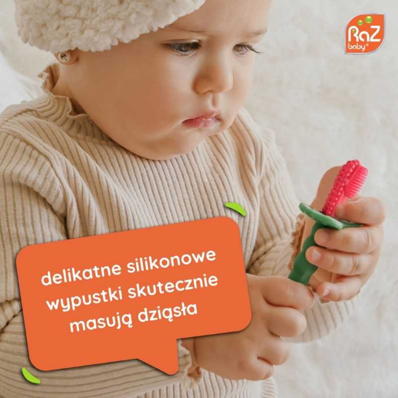 Zdrowe nawyki higieniczne zaczynają się od pierwszego uśmiechu – z miękką szczoteczką RaZbaby to czysta przyjemność!Szczoteczka RaZberry została zaprojektowana specjalnie dla niemowląt – łączy w sobie funkcję masażera dziąseł i wprowadzenie do codziennej pielęgnacji jamy ustnej. Wykonana w 100% z bezpiecznego, miękkiego silikonu spożywczego, jest delikatna, elastyczna i dopasowuje się do małych rączek. Jej innowacyjna forma pomaga dziecku oswajać się z myciem zębów, jednocześnie przynosząc ulgę podczas ząbkowania.