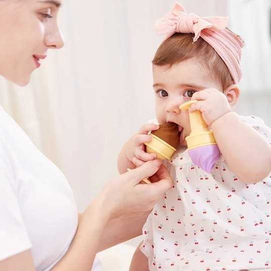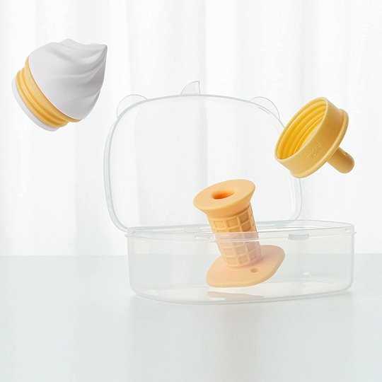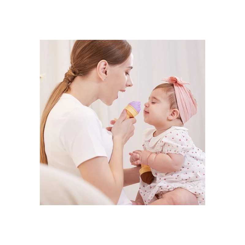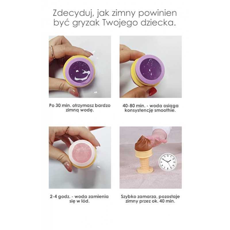 Gryzak chłodzący Smily Mia w kształcie smakowitego loda został stworzony po to, by jeszcze lepiej łagodzić ból i dyskomfort związany z ząbkowaniem. Wystarczy go rozkręcić, wlać wodę do zbiorniczka, umieścić zbiorniczek w zamrażarce, aż do momentu zamarznięcia, następnie wyjąć go, skręcić gryzak i podać dziecku. Maluch nie odmówi sobie pysznych lodów, które dodatkowo schłodzą jego dziąsła, przynosząc ulgę w ząbkowaniu. Kojąca zabawka dla dzieci może być używana w domu i w podróży. Do zestawu dołączone jest bowiem przezroczyste etui, do którego możemy zapakować gryzak chłodzący Smily Mia, gdy wychodzimy na spacer lub wyjeżdżamy na wakacje. Gryzak chłodzący Smily Mia przeznaczony jest dla dzieci w wieku od 3 do 18 miesięcy i spełnia on międzynarodowe normy bezpieczeństwa ASTM-F963 przewidziane dla zabawek dedykowanych dla dzieci.