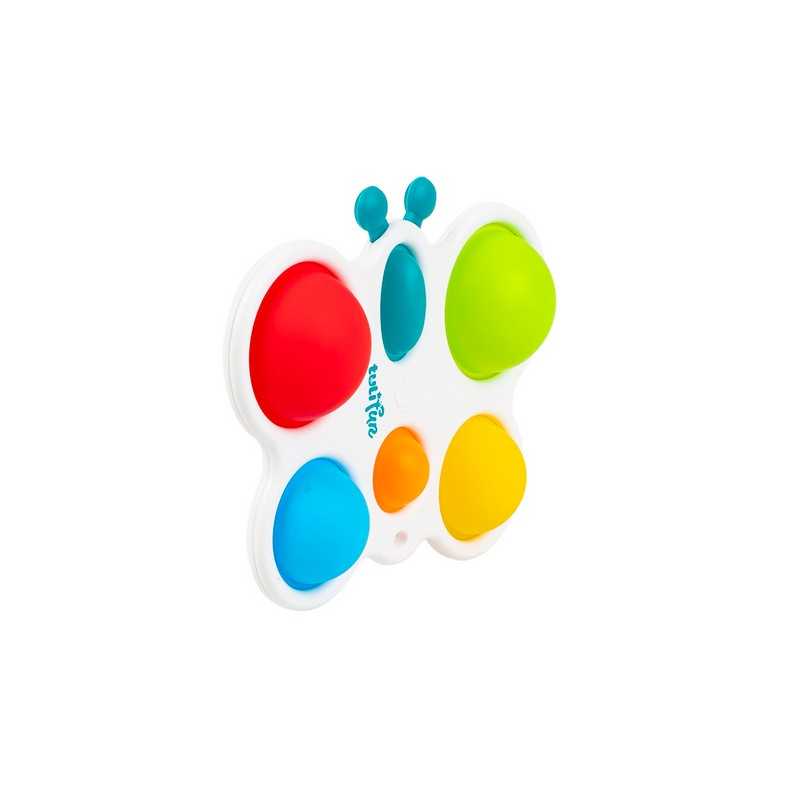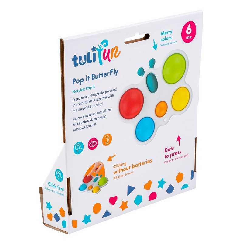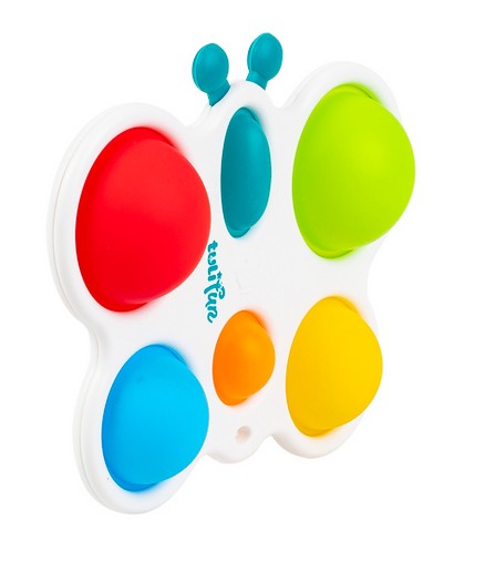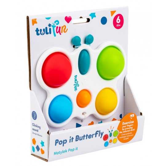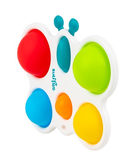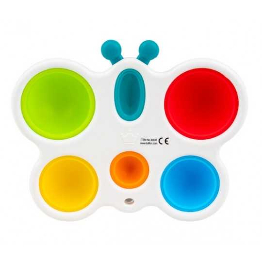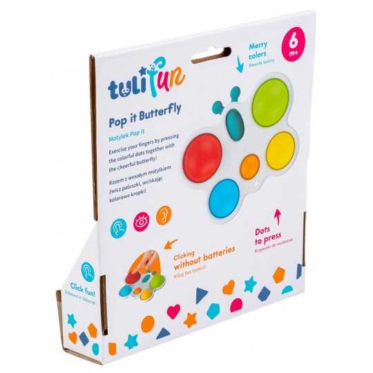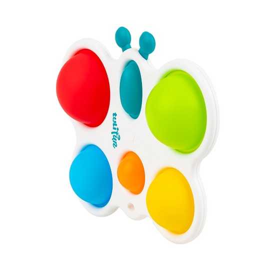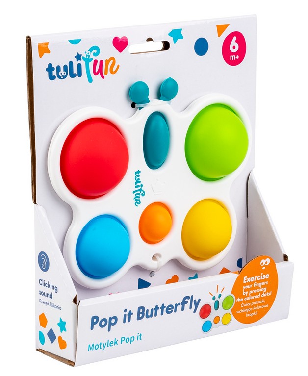 Wesoły motylek odpręży malucha zabawą w kolorowe klikanie! Ta zajmująca czynność stanowi świetną rozrywkę, która dodatkowo pomaga ćwiczyć paluszki. Motylek posiada jedno owalne i pięć okrągłych, kolorowych pól. Zadaniem najmłodszych jest przepchnąć wszystkie wypukłe elementy na drugą stronę zabawki. Czynności tej towarzyszyć będzie zabawny odgłos klikania. Po uporaniu się z zadaniem, motylka można odwrócić na drugą stronę, aby rozpocząć zabawę od nowa. Produkt przeznaczony jest dla dzieci od 6 miesiąca życia.