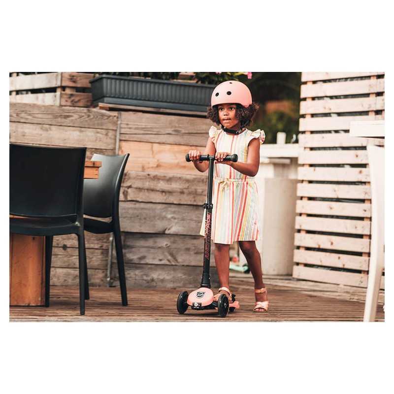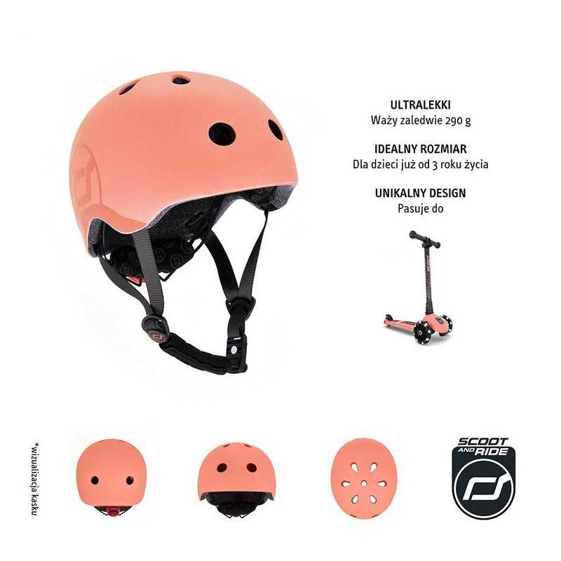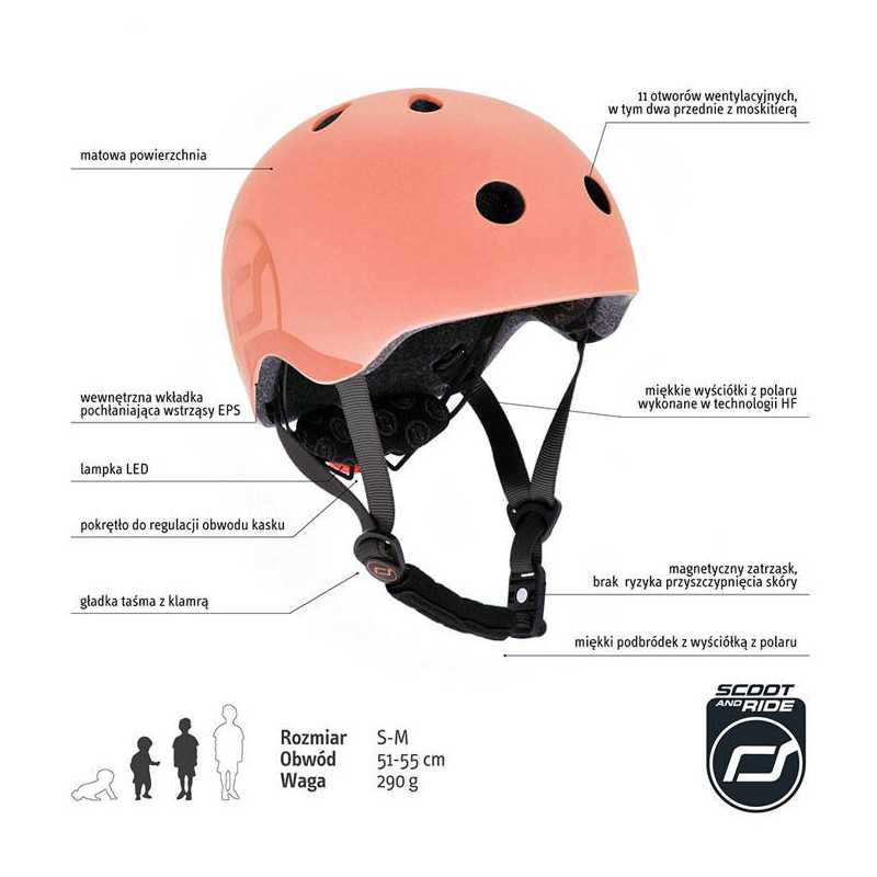 Rośnie z dzieckiem. Ultralekki (waży zaledwie 290 g!), innowacyjny i stylowy dziecięcy kask ochronny austriackiej marki SCOOT&RIDE, który „rośnie” razem z maluchem. Idealny dla dzieci od 3. roku życia, na obwód głowy od 51 do 55 cm, regulowany za pomocą pokrętła z tyłu.