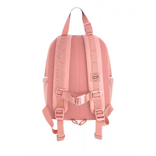 Plecak posiada komorę główną, zapinaną na dwustronny suwak, wewnątrz której znajdują się dwie kieszonki z siatki – jedna z gumką, a druga z zamkiem i breloczkiem na klucze. Z boku plecaka są dwie mniejsze boczne kieszonki na butelki (w jednej z nich jest dodatkowy breloczek na klucze i wizytownik), a z przodu - kieszonka na suwak, idealna na schowanie dziecięcego portfelika czy chusteczek. W dolnej części plecaka jest dodatkowe zapięcie do kierownicy hulajnogi. Z tyłu, z boku i z przodu plecaka znajdują się odblaskowe elementy, które poprawiają widoczność dziecka po zmroku. Plecak jest wykonany z wodoodpornego i łatwego do czyszczenia materiału PET, pochodzącego z recyklingu.