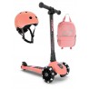 Funkcjonalny, stylowy i ultralekki plecak austriackiej marki Scoot & Ride jest przeznaczony dla dzieci od 1. do 5. roku życia. Ma pojemność całkowitą 9 l, miękko wyściełane, „oddychające” plecy oraz ergonomiczne, szerokie, miękkie ramiączka z regulacją długości i paskiem piersiowym, odciążającym kręgosłup i stabilizującym plecak. W dwóch miejscach wyposażony jest w innowacyjne magnetyczne zapięcie: w pasie piersiowym i przy górnym uchwycie plecaka, dzięki czemu można go przymocować do kierownicy każdej hulajnogi (choć kolorystycznie „zgrany jest” z hulajnogami Highwaykick). Plecaki są dostępne w 4 kolorach, pasujących do hulajnóg i kasków marki Scoot & Ride: szaroniebieskim (Steel), jasnoróżowym (Rose), brzoskwiniowym (Peach) oraz soczyście zielonym (Kiwi).