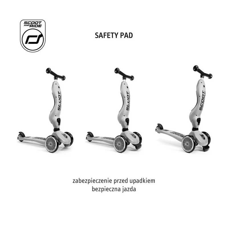 STABILNA I BEZPIECZNA Hulajnoga jest doskonale zbalansowana, stabilna, komfortowa i na dodatek wyjątkowo bezpieczna. Wyposażona została w opatentowany, rewolucyjny system safety-pad – tj. specjalną szeroką podkładkę, umieszczoną w dole przedniej części koszyczka, która zapobiega m. in. przewróceniu się na nierównym terenie czy utknięciu kół. Jej pozycję w razie potrzeby również można regulować. Highwaykick 1 Push and Go stanie się towarzyszem zabaw Twojego dziecka na wiele lat.