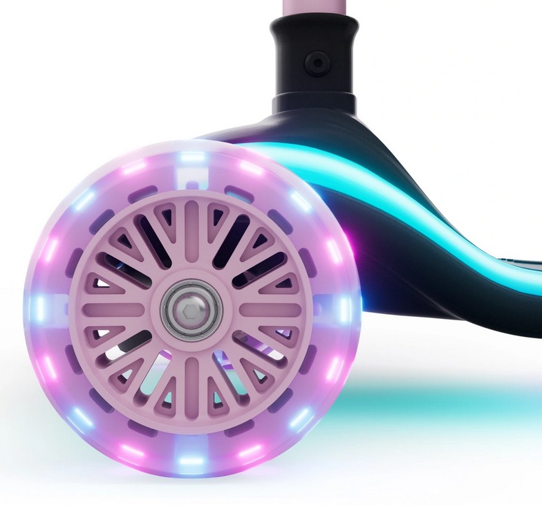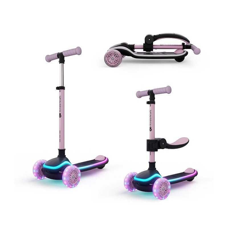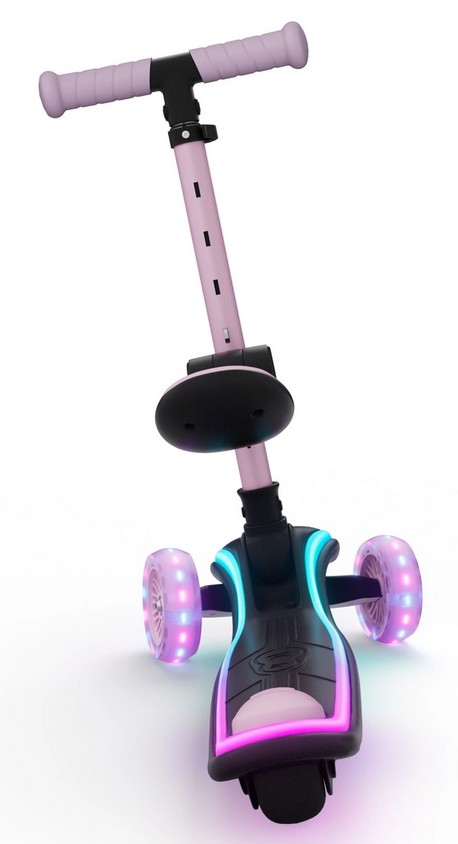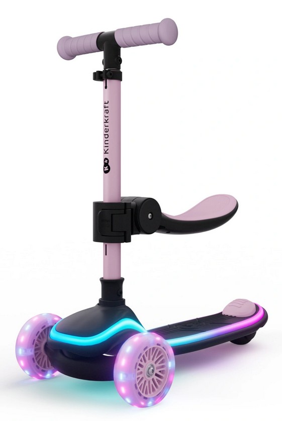 Świecąca hulajnoga dla dzieci 2w1 z siedziskiem: jeździk na start i hulajnoga na kolejne etapy. LED w podeście i koła RGB świecą, a lekko toczące się koła ułatwiają prowadzenie. Siedzisko 25/27,5/30 cm i kierownica 63-78 cm dopasują się do wzrostu, a po złożeniu ciągniesz ją jak walizkę.