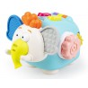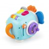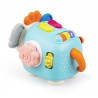 Na grzbiecie zwierzaka znajdują się dwa klikające przyciski, a na jego bokach terkoczący kwiatek i kółeczko, wypełnione grzechoczącymi koralikami, oraz obrotowe elementy.