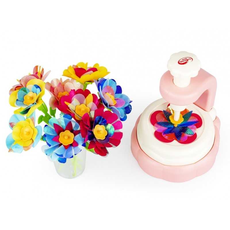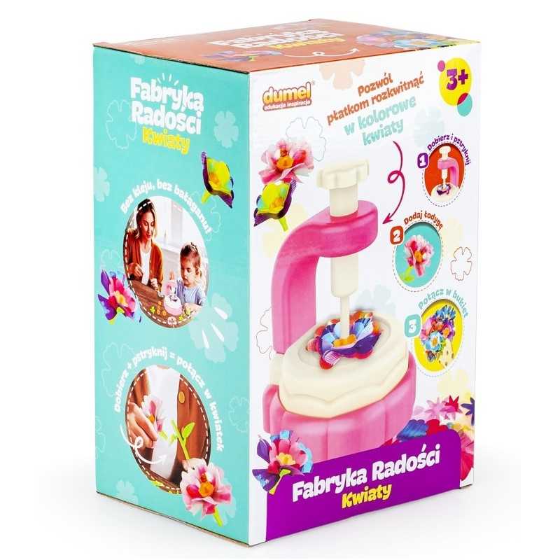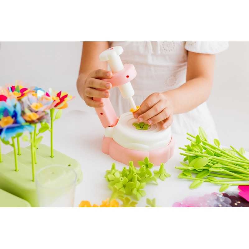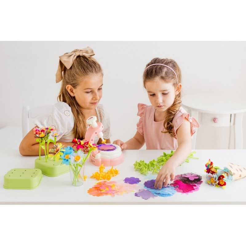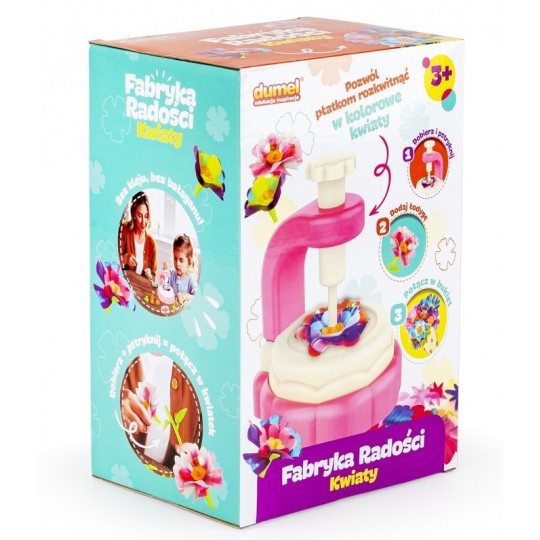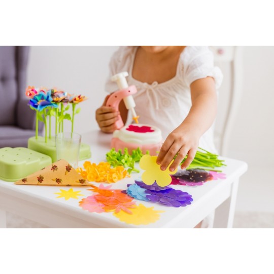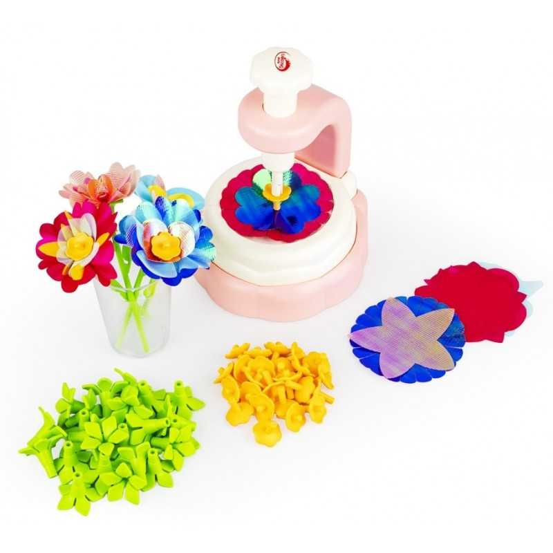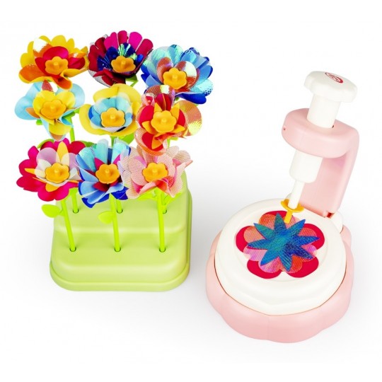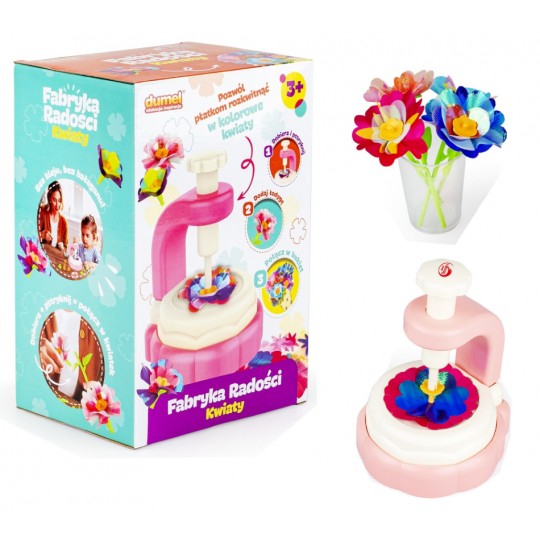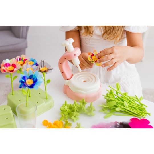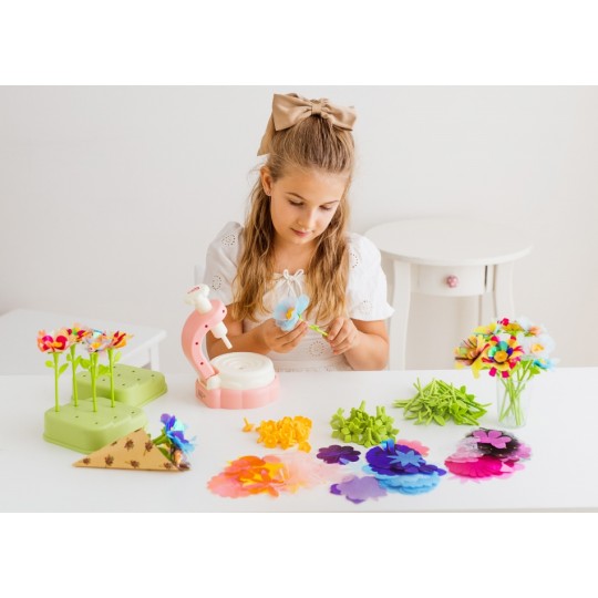 Wkrocz do kolorowego świata wiecznej wiosny! Projektuj kwiatki i komponuj z nich barwne bukiety, tworząc małe dzieła sztuki. Wybierz płatki, umieść je w maszynce, a następnie połącz płatki ze środkiem oraz szypułką. Teraz wystarczy już tylko dodać łodygę i uroczy kwiatek gotowy! Zabawkowe roślinki możesz wyeksponować w dołączonym do zestawu wazoniku, stojaku lub, umieszczając je w papierowym rożku, stworzyć z nich bukiet. Te piękne ozdoby sprawdzą się też wspaniale w charakterze prezentu dla bliskiej osoby. Produkt przeznaczony jest dla dzieci od 3 roku życia.