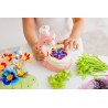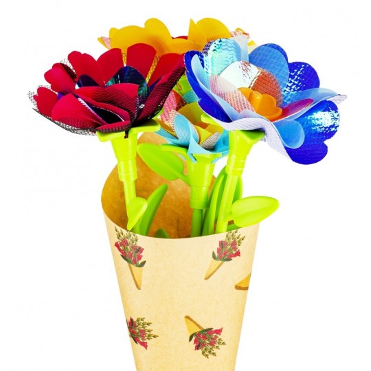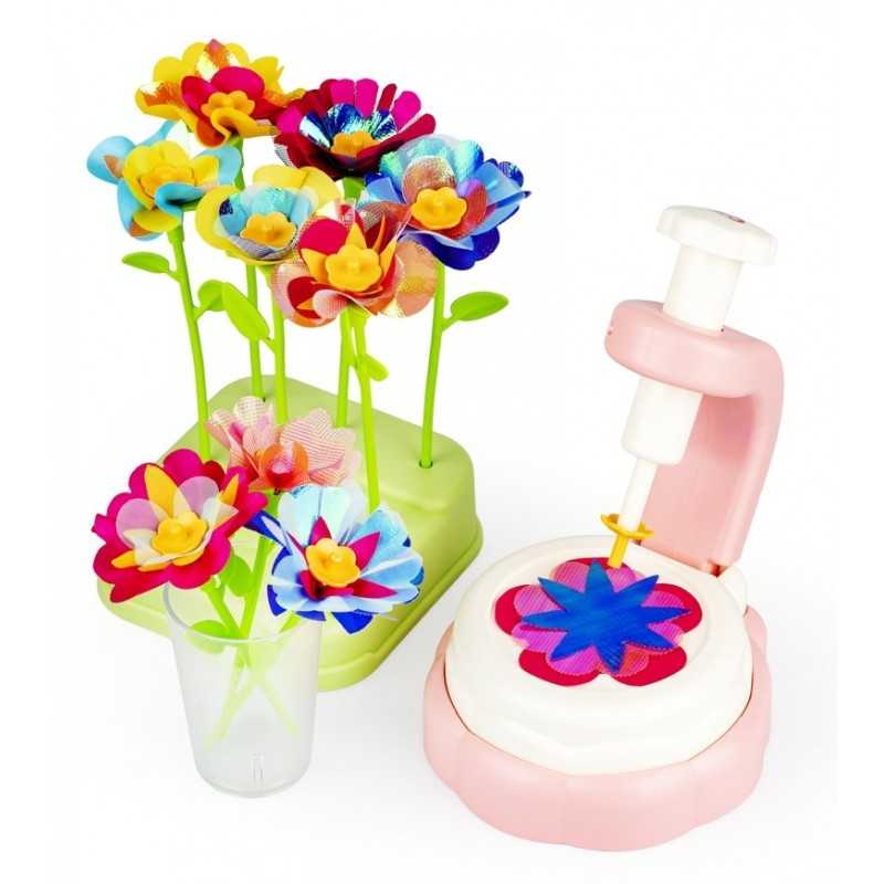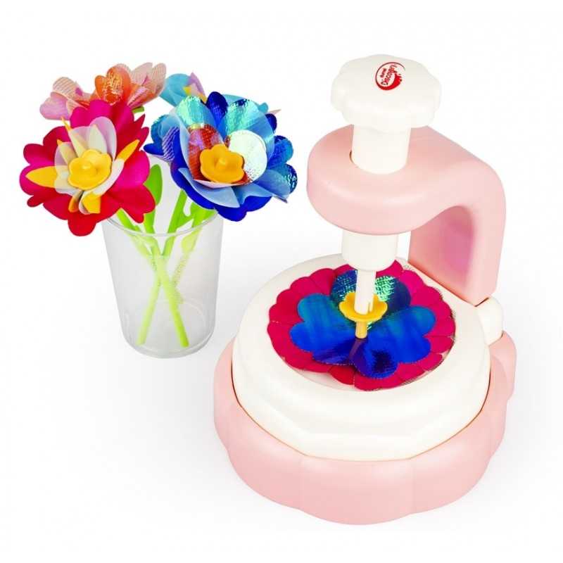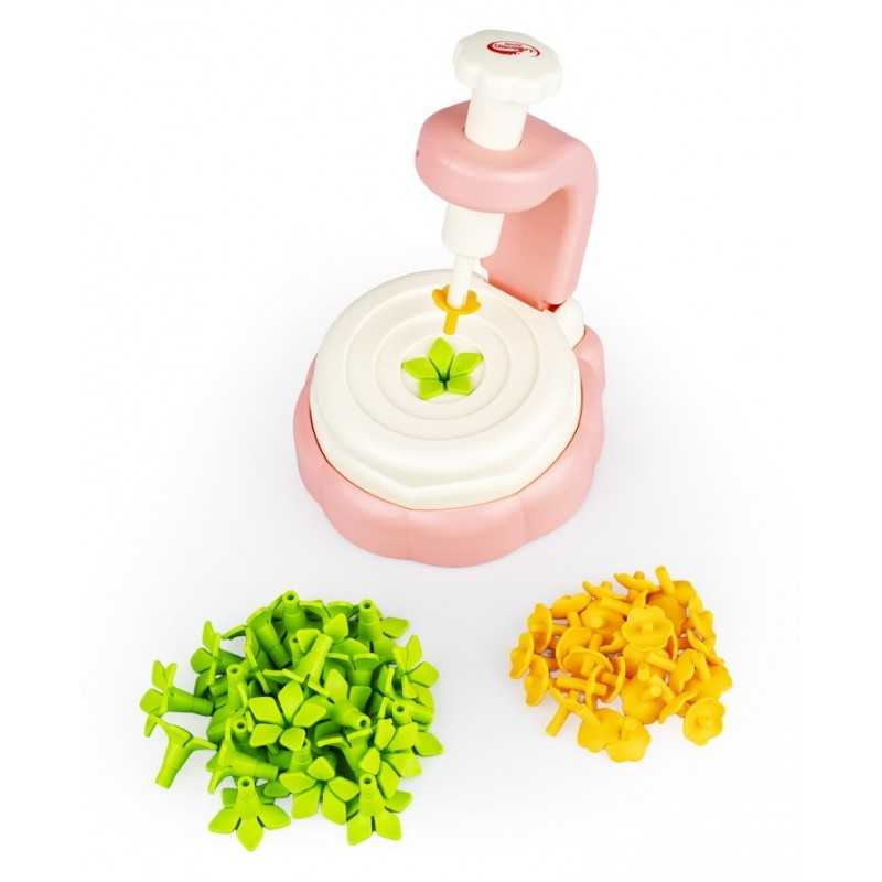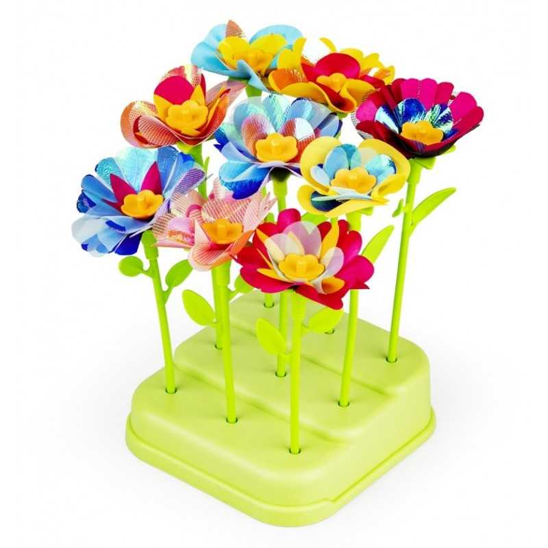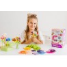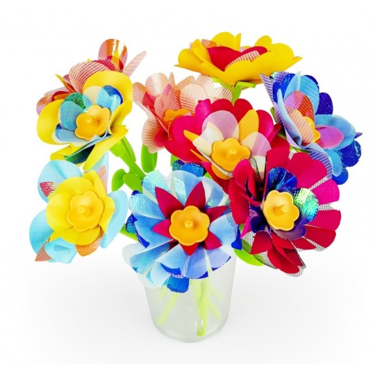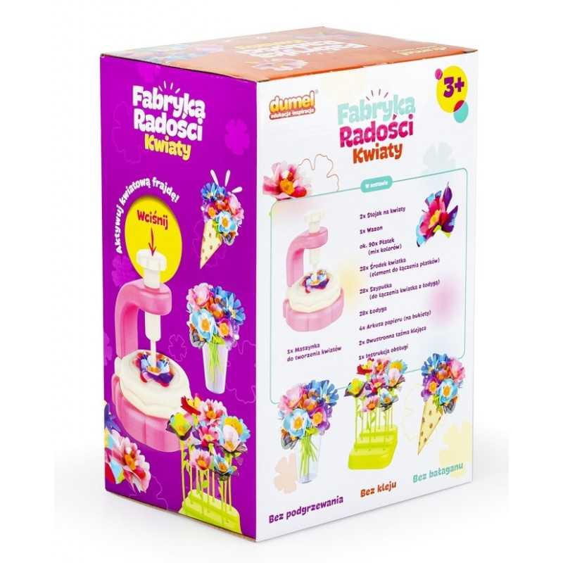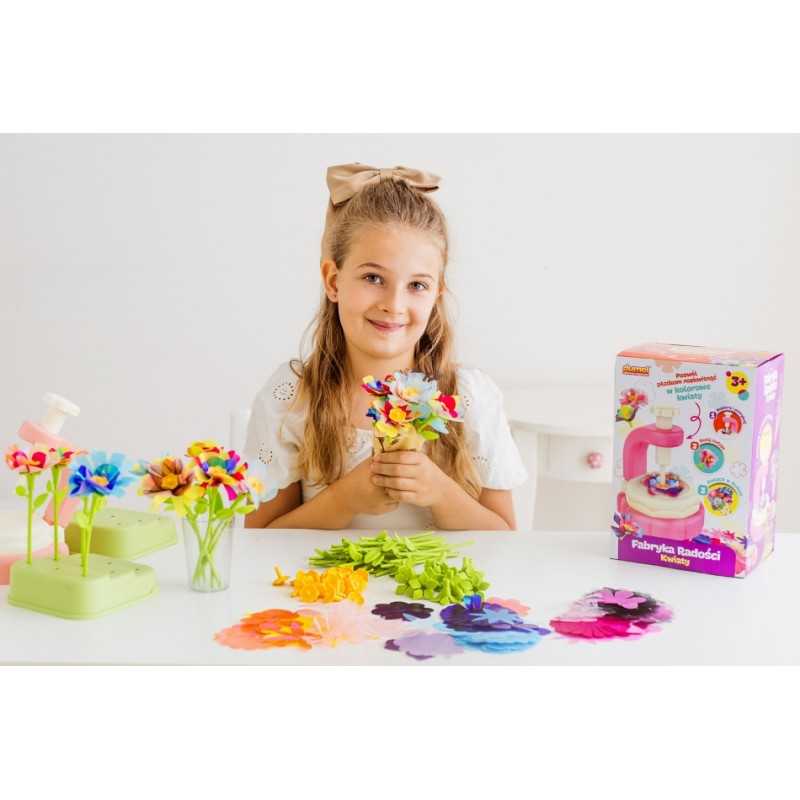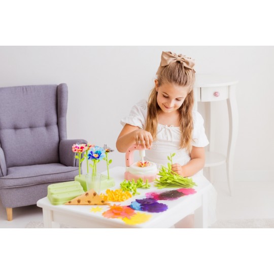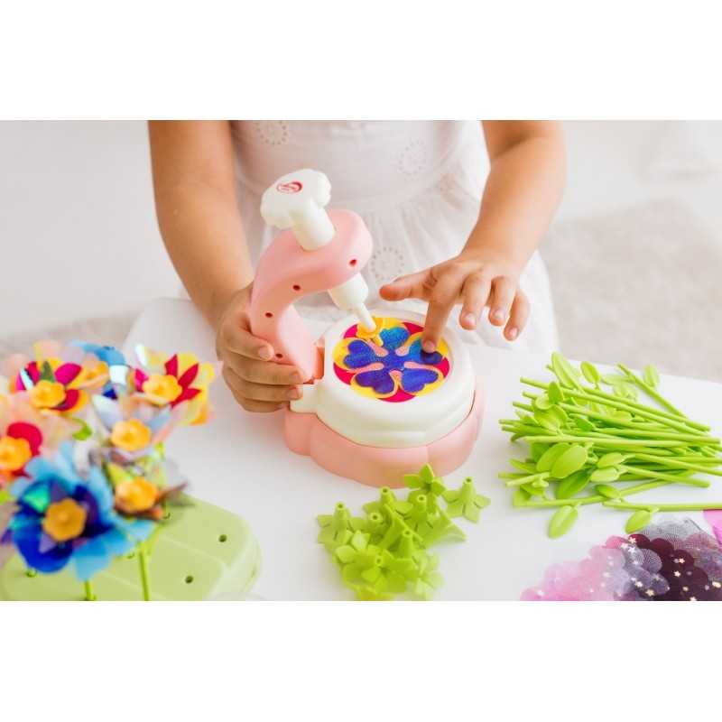 Wkrocz do kolorowego świata wiecznej wiosny! Projektuj kwiatki i komponuj z nich barwne bukiety, tworząc małe dzieła sztuki. Wybierz płatki, umieść je w maszynce, a następnie połącz płatki ze środkiem oraz szypułką. Teraz wystarczy już tylko dodać łodygę i uroczy kwiatek gotowy! Zabawkowe roślinki możesz wyeksponować w dołączonym do zestawu wazoniku, stojaku lub, umieszczając je w papierowym rożku, stworzyć z nich bukiet. Te piękne ozdoby sprawdzą się też wspaniale w charakterze prezentu dla bliskiej osoby. Produkt przeznaczony jest dla dzieci od 3 roku życia.