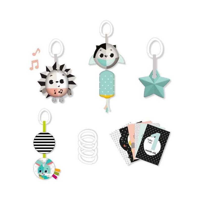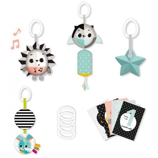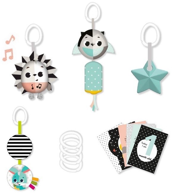 Karty pomogą urozmaicić fotorelację Twojego dziecka. Pierwszy miesiąc życia, pierwszy uśmiech- to momenty które warto uchwycić, a nasze karty pomogą Ci w tym. Przeprowadzą Cię przez pierwszy rok życia dziecka z ważnymi wskazówkami oraz pomysłami na zabawę każdego dnia.W nowej serii zawieszek od Tiny Love  znajdziesz zabawki nie tylko do wózka, ale również do fotelika. Dzięki tej opcji na dłużej przyciągniesz uwagę malucha podczas długiej jazdy samochodem, podróży oraz po prostu czasu spędzonego na spacerze.W naszym zestawie znajdują się gadżety i bohaterowie, którzy cieszą nie tylko swym wyglądem, ale również ciekawymi funkcjami. Świetnym tego przykładem jest Marie- muzyczna zabawka lub Sowa Dzwoneczek, które dzięki dźwiękom rozwijają zmysł słuchu i zapewniają ciekawsze doznania z zabawy.Zestaw zawiera wiele zróżnicowanych elementów do zabawy, dzięki temu Twoje dziecko na dłużej zaciekawi zestaw zawieszek a Ty zyskasz inspirację do zabawy z nim lub wolny czas tylko dla siebie. Elementy szeleszczące pobudzają wyobraźnie dziecka, a delikatna struktura zabawek zachęci do przytulania naszych bohaterów.