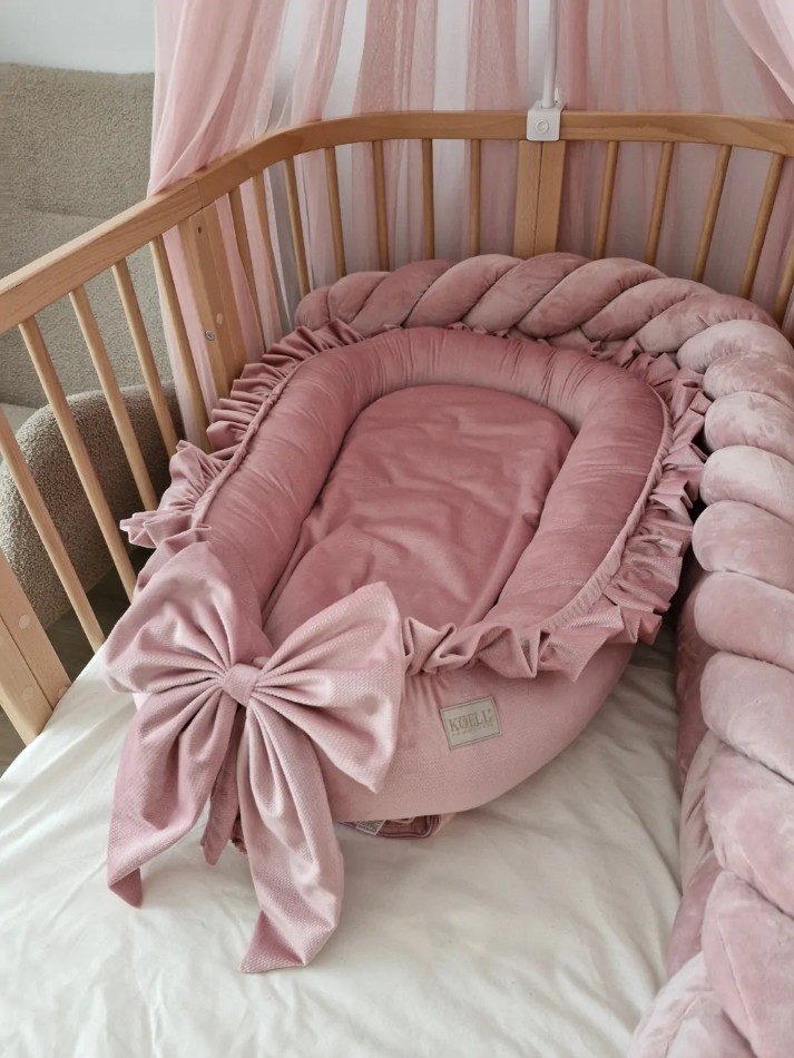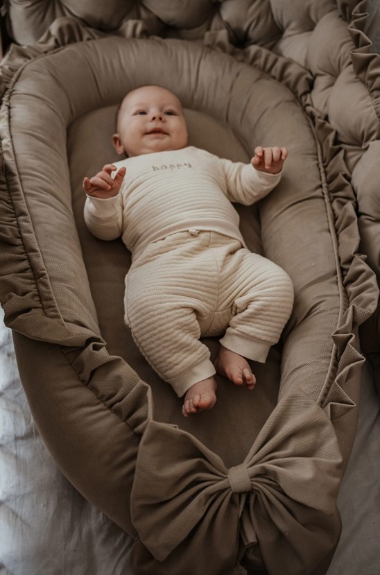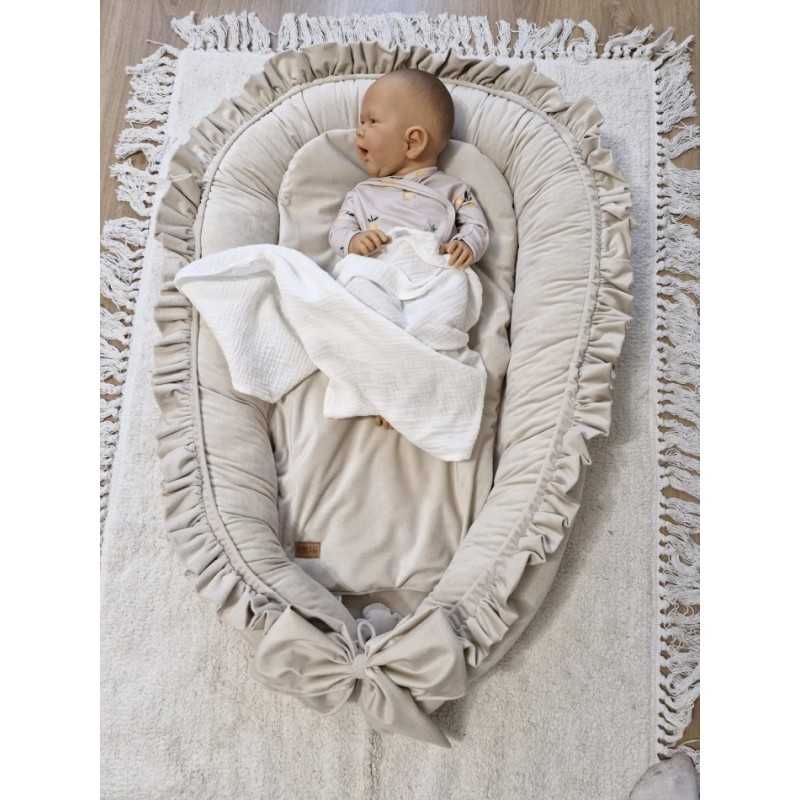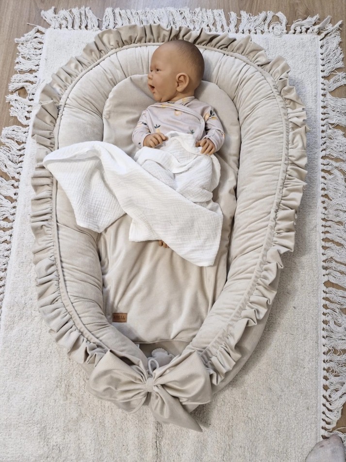 Kokon niemowlęcy z falbanką i dużą kokardą, przeznaczony dla noworodków od pierwszych dni życia aż do nawet 12 miesiąca. Zapewnia poczucie bezpieczeństwa, dając namiastkę tego co dziecko czuło przez 9 miesięcy przed pojawieniem się na świecie. Pomaga ukoić niespokojny sen i nastrój maluszka ponieważ jest niezwykle przyjemny i delikatny w dotyku. Nasze gniazdko niemowlęce to absolutny must have każdej wyprawki! W ofercie posiadamy także inne wzory i kolory kokonów dostępne na naszej stronie tutaj lub w mediach społecznościowych facebook, instagram.  Kokon dla noworodka to rozwiązanie bardzo praktyczne, ułatwiające codzienne funkcjonowanie. Znajduje swoje zastosowanie przede wszystkim w łóżeczku, ale i w wielu innych sytuacjach pełniąc rolę przenośnego łóżeczka np. w salonie, kuchni, łazience. Niemowlę śpiąc w kokonie nie odczuwa nagłej zmiany miejsca. Łatwiej jest mu się wyciszyć i zasnąć, ponieważ nawet w obcym miejscu czuje się jak u siebie w domu. Kokon może posłużyć również jako podkładka pod klatkę piersiową dla niemowlaka podczas leżakowania na brzuszku lub w nieco późniejszym okresie życia jako podpórka podczas pierwszych prób siadania. W przypadku starszych dzieci produkt może być rozwiązany w dolnej części, dzięki czemu powstanie strefa nie ograniczająca ruchów nóżek.