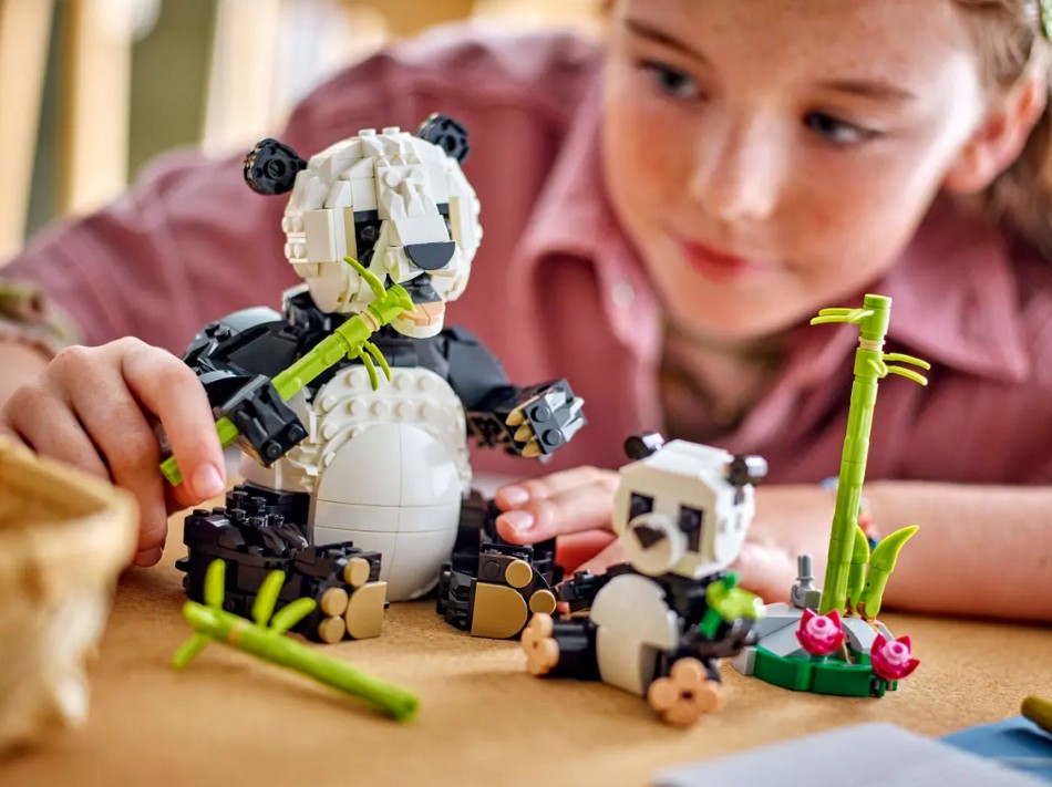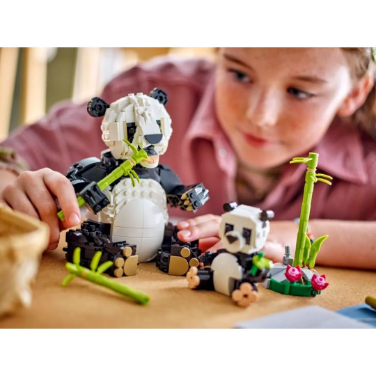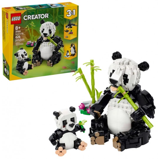 Dzięki zestawowi Dzikie zwierzęta: rodzina pand (31165) ośmiolatki i starsze dzieci zapoznają się z trzema zwierzęcymi rodzinami. Model zawiera dorosłą pandę z ruchomym pyszczkiem, głową, szyją i łapami oraz jej młode z pędem bambusa. Dzieci mogą zbudować jeden z trzech modeli LEGO z tego samego zestawu klocków: ruchomą pandę z młodym obok łodyg bambusa, ruchomą orkę z dzieckiem, które można ustawić na przezroczystych podstawkach lub ruchomego pingwina z pisklęciem na kawałku lodu i wody. Wszystkie trzy sceny sprawdzą się podczas zabawy i ustawiania na półce. Ten zestaw to świetny pomysł na prezent dla dzieci. Zestawy LEGO Creator 3 w 1 pobudzają wyobraźnię dzieci dzięki trzem różnym modelom do zbudowania w jednym pudełku. Można je budować i przebudowywać do woli. Różnorodność modeli sprawia, że zestawy trafią w każdy gust: miłośników superszybkich pojazdów, niesamowitych zwierząt czy budynków. Należy pamiętać, że nie można zbudować trzech modeli jednocześnie.