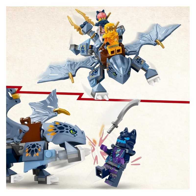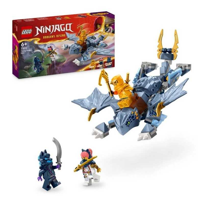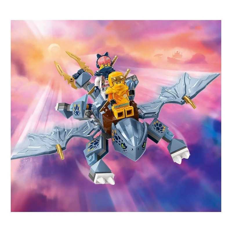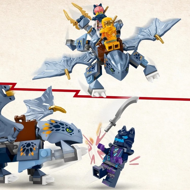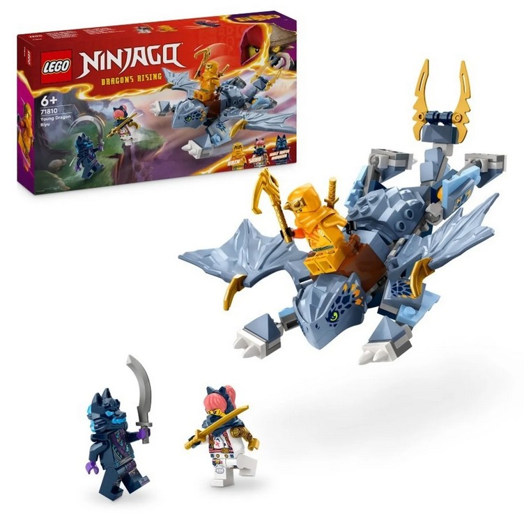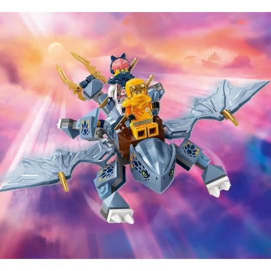 Dzięki zestawowi Smoczątko Riyu (71810) sześciolatki i starsze dzieci mogą odtwarzać powietrzne przygody z drugiego sezonu serialu telewizyjnego NINJAGO: Powstanie Smoków. Zestaw zawiera model smoczątka Riyu z ruchomymi skrzydłami i nogami, ruchomym ogonem i siodłem, dzięki czemu minifigurki mogą jeździć na jego grzbiecie. W tym zestawie znajdują się trzy minifigurki: Arin uzbrojony w hak do wspinaczki i miecz, Sora z kataną oraz nikczemny wojownik Wilczej Maski z mieczem. Dzieci mają więc wszystko, czego potrzebują, aby odgrywać rolę wojowników ninja i toczyć pełne akcji bitwy. Seria zabawek ninja do zbudowania dla dzieci LEGO NINJAGO obejmuje mechy, pojazdy i świątynie, dzięki czemu fani mogą odgrywać niesamowite przygody. Każdy zestaw bitewny można zbudować z pomocą aplikacji LEGO Builder, która poprowadzi Ciebie i Twoje dziecko przez przygodę z łatwym i intuicyjnym budowaniem.