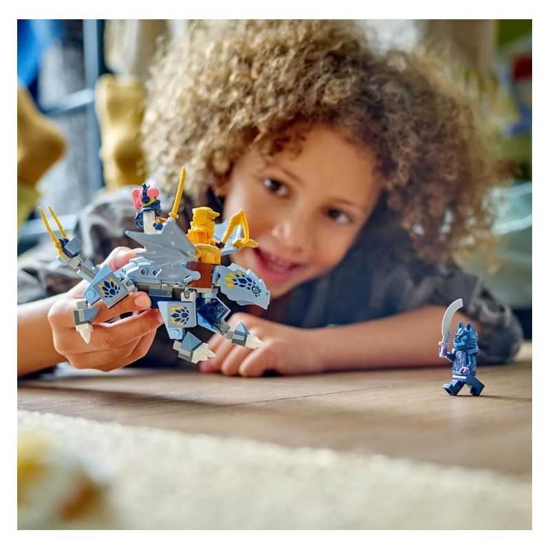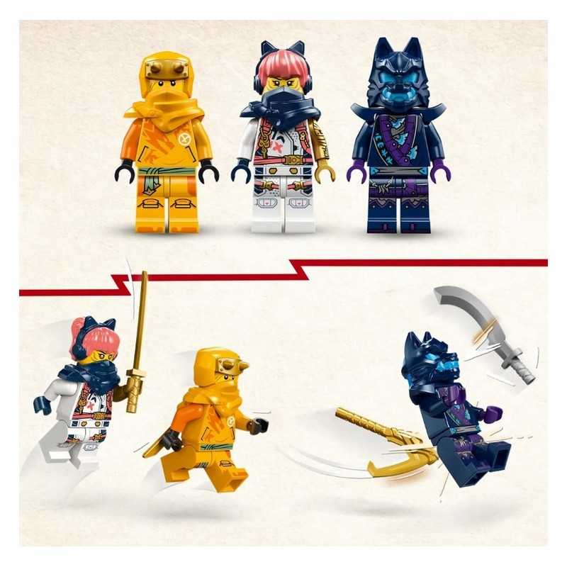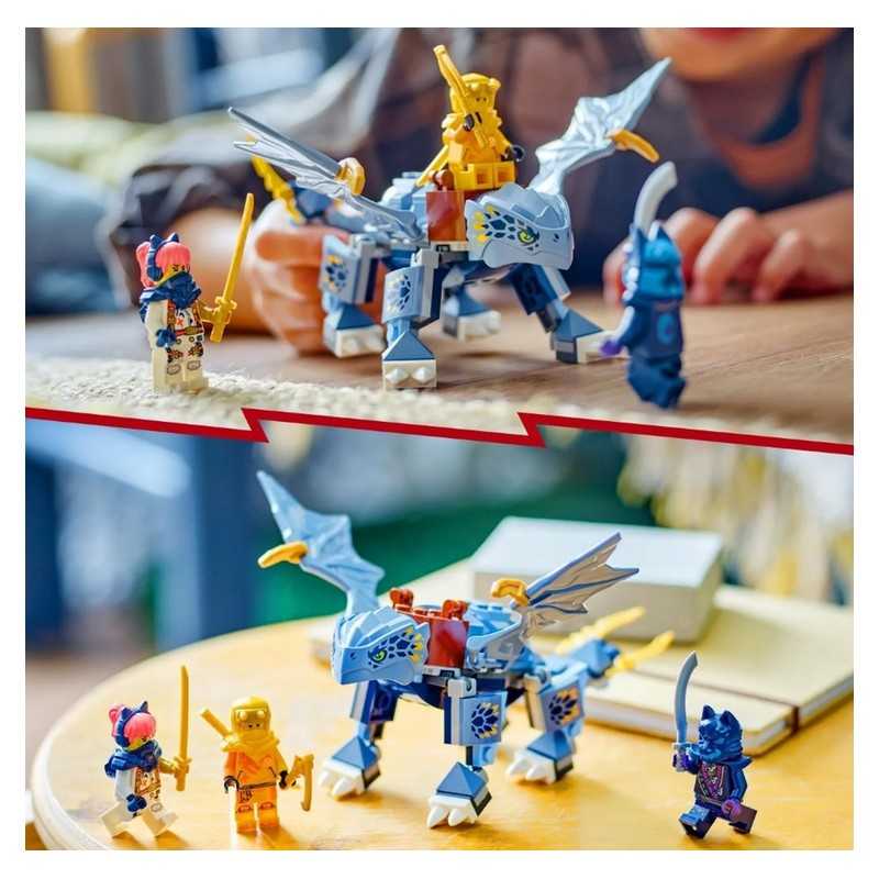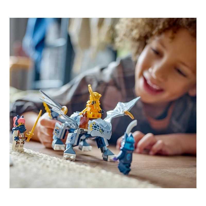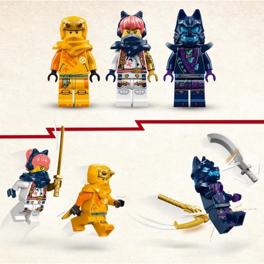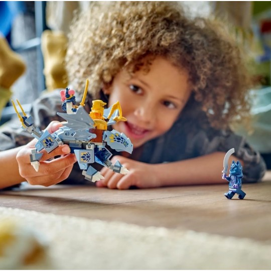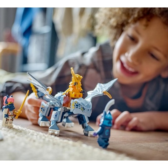 Dzięki zestawowi Smoczątko Riyu (71810) sześciolatki i starsze dzieci mogą odtwarzać powietrzne przygody z drugiego sezonu serialu telewizyjnego NINJAGO: Powstanie Smoków. Zestaw zawiera model smoczątka Riyu z ruchomymi skrzydłami i nogami, ruchomym ogonem i siodłem, dzięki czemu minifigurki mogą jeździć na jego grzbiecie. W tym zestawie znajdują się trzy minifigurki: Arin uzbrojony w hak do wspinaczki i miecz, Sora z kataną oraz nikczemny wojownik Wilczej Maski z mieczem. Dzieci mają więc wszystko, czego potrzebują, aby odgrywać rolę wojowników ninja i toczyć pełne akcji bitwy. Seria zabawek ninja do zbudowania dla dzieci LEGO NINJAGO obejmuje mechy, pojazdy i świątynie, dzięki czemu fani mogą odgrywać niesamowite przygody. Każdy zestaw bitewny można zbudować z pomocą aplikacji LEGO Builder, która poprowadzi Ciebie i Twoje dziecko przez przygodę z łatwym i intuicyjnym budowaniem.