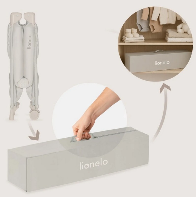 Łóżeczko składa się w kilka chwil. Po złożeniu zajmuje zaledwie 19,5 × 19,5 × 71 cm. Bez problemu wsuniesz je pod łóżko, schowasz w szafie albo ustawisz w rogu pokoju. Podczas wyjazdu łóżeczko bez trudu zmieści się w bagażniku. Torba z wygodnym uchwytem ułatwia przenoszenie i przechowywanie łóżeczka, chroniąc je przed zabrudzeniem zarówno w domu, jak i w podróży.