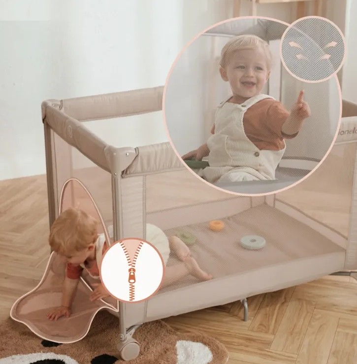 Boki łóżeczka wykonano z lekkiej, przewiewnej siatki, która zapewnia odpowiednią cyrkulację powietrza podczas snu i zabawy. Dzięki temu maluszek czuje się komfortowo, a rodzice mogą swobodnie obserwować swoje dziecko przez cały czas.