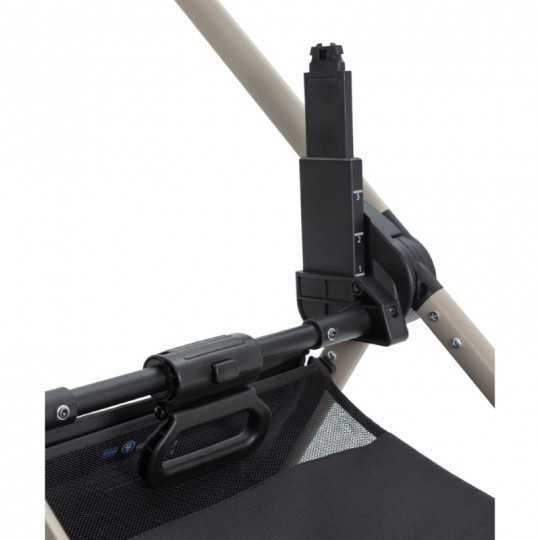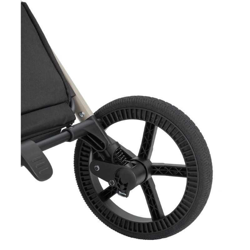 Duże gumowe koła zapewniają dobrą mobilność w terenie. Adaptacyjna amortyzacja wózka zamortyzuje jazdę i pochłonie drgania. Wszystkie koła posiadają zawieszenie ze sprężynami. Przednie koła są blokowane do jazdy wprost. Posiada regulację wysokości rączki.Te same adaptery nadają się zarówno do gondoli, jak i do przesuwanego siedziska. Lekka aluminiowa rama jest bardzo wytrzymała i składa się kompaktowo wraz z wózkiem.