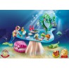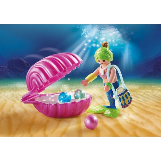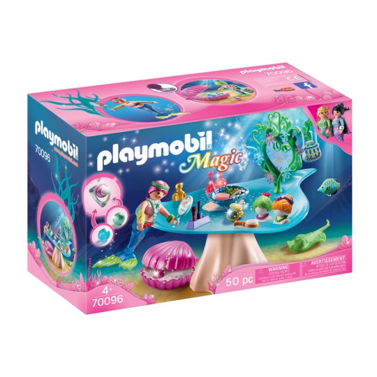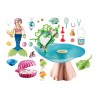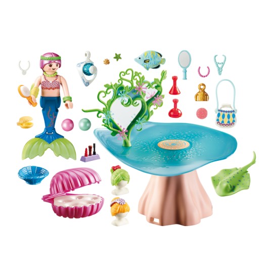 W jej magicznym podwodnym salonie piękności syrena przygotowuje się. Jaka powinna być fryzura i jakie ozdoby do włosów pasują? Przez długi czas syrenka próbuje różnych wariantów przed lustrem i ostatecznie decyduje o srebrnym łańcuchu. Teraz szybko włóż torbę i możesz zacząć. Zostaje zaproszona na bal w Pawilonie Koralowym i nie może się spóźnić.Figurki: 1 syrena;Zwierzęta: 1 motyl, 1 płaszczka;Akcesoria: 1 salon kosmetyczny z lustrem koralowym, 1 pudełko perłowe, 3 perły, 1 wisior, 1 muszla, 1 gąbka, 1 kosz, 2 butelki, 1 butelka, 1 torebka, 1 lustro ręczne, 1 szczotka do włosów, 4 naszyjniki, 2 kokardy do włosów, 1 pierścień do włosów, 2 Bransoletki, 2 popiersia z perukami i akcesoriami do włosów, 1 stojak z pomadką, tusz do rzęs i pędzelkiem do pudru