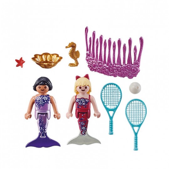Playmobil Syrenki podczas zabawy 70881. Pod wodą zawsze dużo się dzieje. Dziś dwie syreny spotykają się, żeby pograć w tenisa. Najpierw rozstaw siatkę tenisową, przygotuj rakiety, a następnie możesz rozpocząć grę. Grzebień może służyć jako siatka do tenisa lub jako ozdoba do włosów. Figurki mogą siedzieć i stać na płetwie ogonowej. Figurki PLAYMOBIL Special Plus ze wspaniałymi dodatkami są idealnym prezentem.