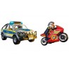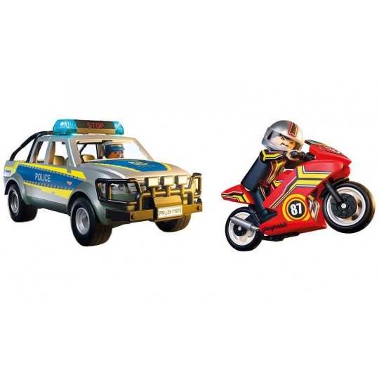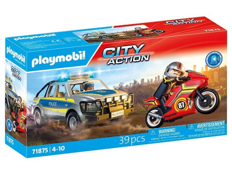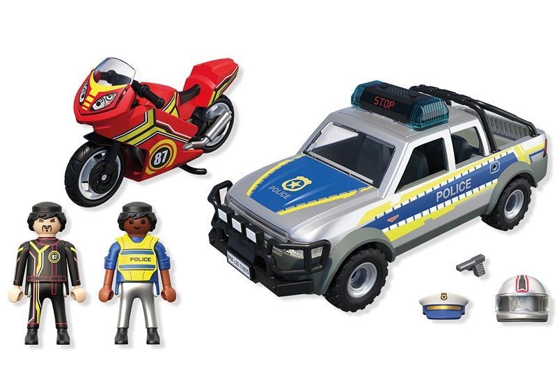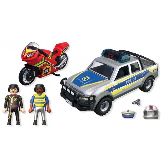 Czy złodziejowi uda się uciec na swoim czerwonym motocyklu? Pędzi po miejskich drogach, ale nie wie, że tuż za rogiem patroluje dzielna policjantka w potężnym policyjnym pick-upie! Wystarczy włączyć niebieskie światła i syrenę, by rozpocząć prawdziwy pościg. Policyjna broń gotowa do akcji, migające światła i przeszywający dźwięk – rabuś nie ma szans! Gdy tylko przestępca zostanie schwytany, motocykl można przewieźć na pakiecie pick-upa prosto na komisariat! W samochodzie zmieszczą się aż cztery figurki (sprzedawane osobno), dzięki czemu zestaw może stać się częścią większego, policyjnego świata Playmobil. Ten pakiet to nie tylko pojazdy, ale kompletna scena akcji, która zachęca do wymyślania własnych historii – od patrolu na ulicach miasta, przez zasadzki na złoczyńców, aż po efektowne zatrzymania.