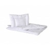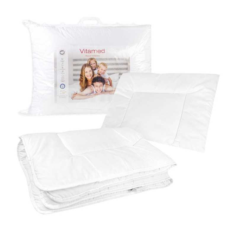 Kompleciki Vitamed z delikatnej, białej mikrofazy. Odporność na pranie w wysokiej temperaturze pozwala na eliminację alergenów, co sprawia, że kołderki i poduszki są bezpieczne dla maluszków. Komplety dziecięce pokryte są oddychającą tkaniną z delikatnych mikrowłókien, która zapewnia odpowiednią cyrkulację powietrza przez co produkty przyspieszają wypoczynek i ułatwiają odprężenie psychiczne. Produkty z linii Vitamed posiadają pozytywną ocenę Kliniki Neurologii Samodzielnego Szpitala Klinicznego Nr 4 w Lublinie potwierdzającą ich profilaktyczno- lecznicze właściwości. Artykuły można prać w temperaturze 95°C przez co doskonale będą się nadawać dla osób ze skłonnościami alergicznymi. Wyjątkowo lekkie i otulające kołdry nie ograniczają ruchów śpiącego. Wygodne i trwałe poduszki niezwykle długo zachowują swój pierwotny kształt. Produkty certyfikowane wg Oeko-Tex Standard 100 kl. I – bezpieczne dla niemowląt i dzieci do lat 3. TKANINA: Mikrofaza – oddychająca tkanina z delikatnych mikrowłókien. WYPEŁNIENIE: Antyalergiczne wypełnienie wyprodukowane z włókien poliestrowych silkonowanych, karbikowanych, typu hollow (HCS).