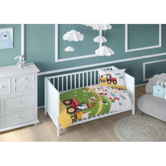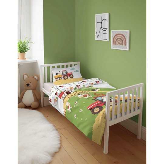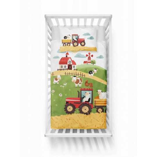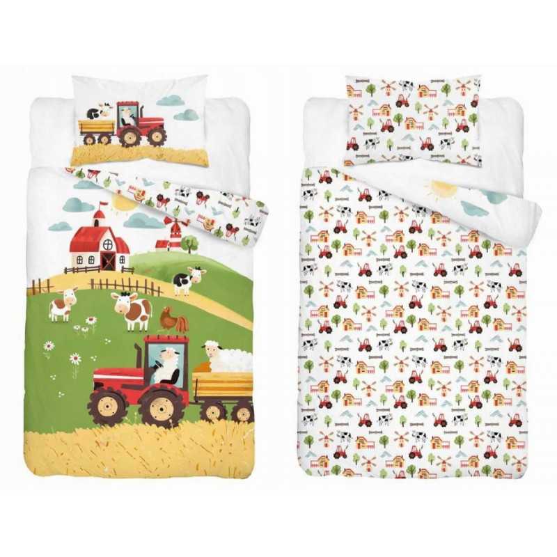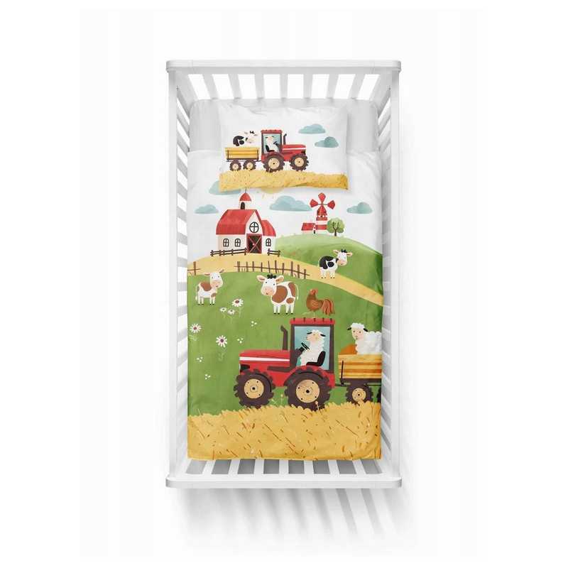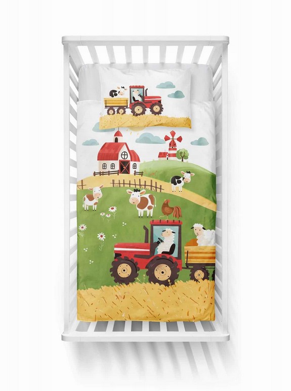 Pościel bawełniana dziecięca 90x120 farma czerwony traktor – 5513 A to idealny wybór dla małych miłośników zwierząt i wiejskich przygód. Barwna grafika przedstawiająca traktor, krowy, owce, koguta i malowniczą farmę przenosi dziecko w radosny świat zabawy i odkrywania natury. Pościel wprowadza do pokoju dziecięcego bajkowy klimat, który rozwija wyobraźnię i daje poczucie bezpieczeństwa. Komplet posiada dwustronny wzór – z jednej strony duża ilustracja farmy z traktorem i zwierzątkami, z drugiej drobny, powtarzalny motyw w jasnej tonacji, który świetnie urozmaica aranżację. Dzięki temu zestaw jest praktyczny i dekoracyjny zarazem. Wykonany ze 100% naturalnej bawełny, zapewnia komfort, przewiewność i miękkość, a bezpieczne suwaki ułatwiają codzienne użytkowanie.