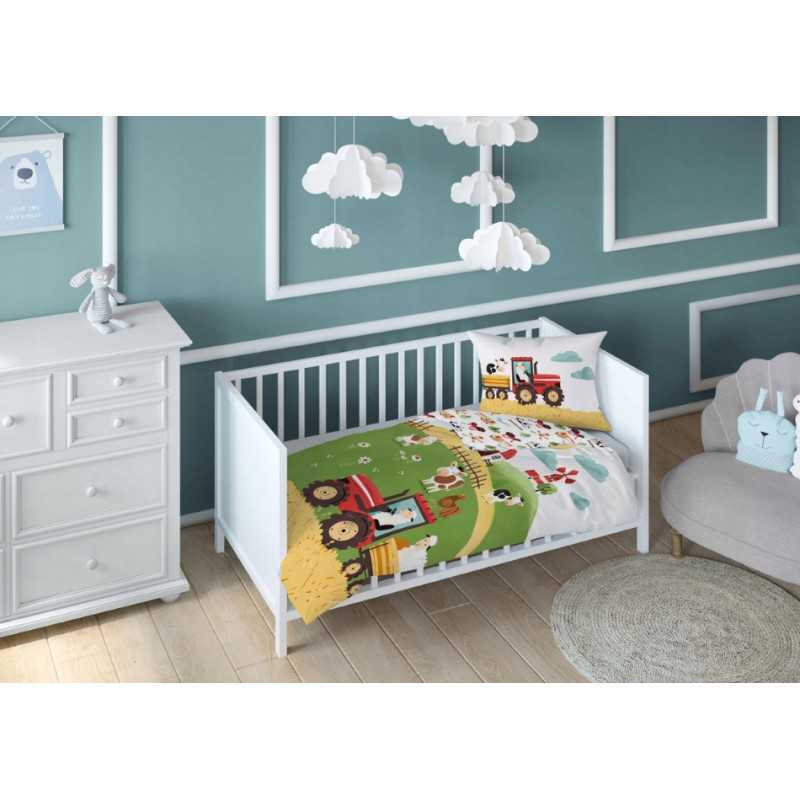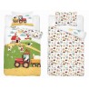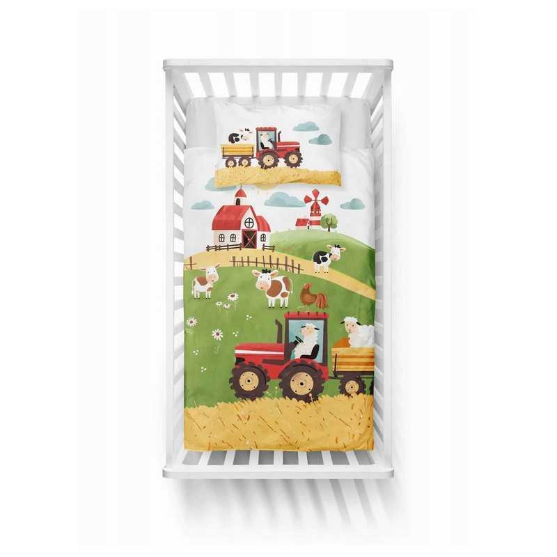 Pościel bawełniana dziecięca 100x135 cm farma czerwony traktor – 5513 A to idealny wybór dla małych miłośników zwierząt i wiejskich przygód. Barwna grafika przedstawiająca traktor, krowy, owce, koguta i malowniczą farmę przenosi dziecko w radosny świat zabawy i odkrywania natury. Pościel wprowadza do pokoju dziecięcego bajkowy klimat, który rozwija wyobraźnię i daje poczucie bezpieczeństwa. Komplet posiada dwustronny wzór – z jednej strony duża ilustracja farmy z traktorem i zwierzątkami, z drugiej drobny, powtarzalny motyw w jasnej tonacji, który świetnie urozmaica aranżację. Dzięki temu zestaw jest praktyczny i dekoracyjny zarazem. Wykonany ze 100% naturalnej bawełny, zapewnia komfort, przewiewność i miękkość, a bezpieczne suwaki ułatwiają codzienne użytkowanie.