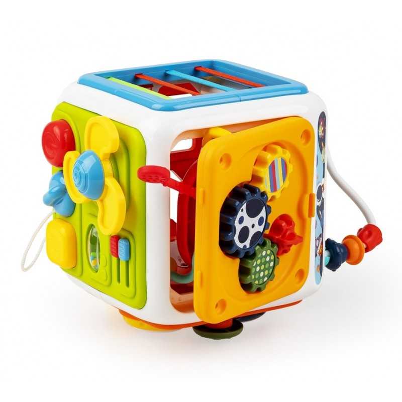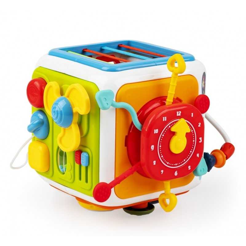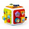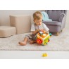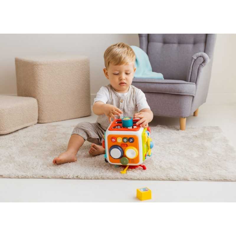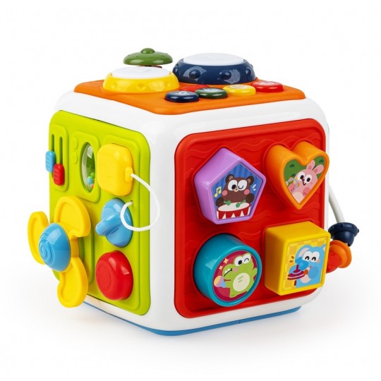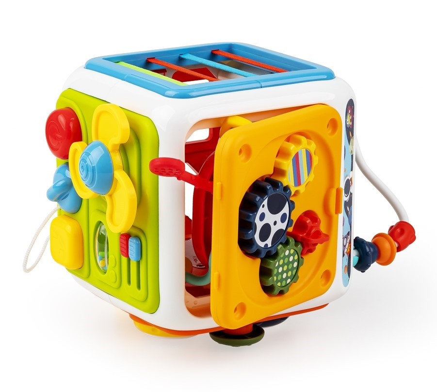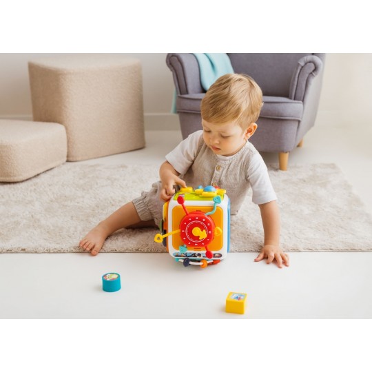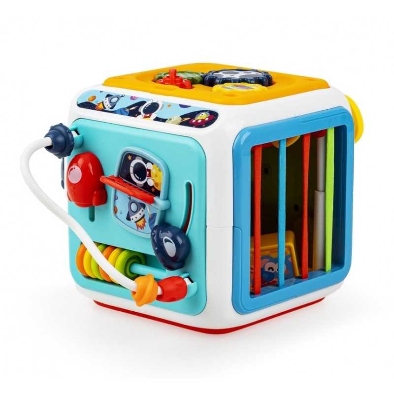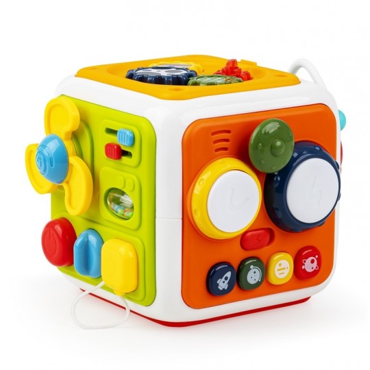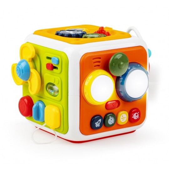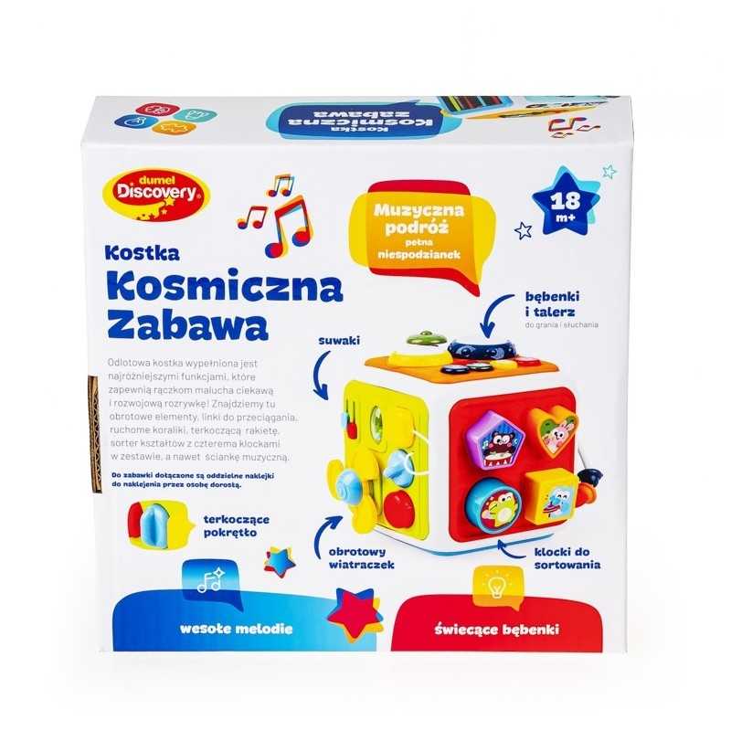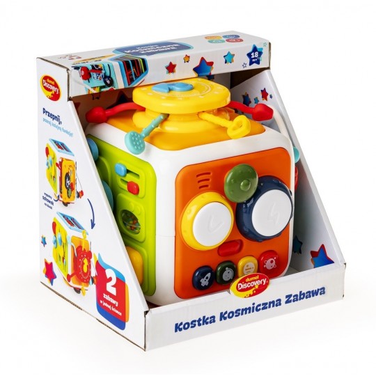 Baw się kosmicznie z kostką pełną dźwięków i zręcznościowych niespodzianek! Każda ze ścianek to inna, kolorowa przygoda. Znajdziemy tu elementy do przesuwania, śmigło do obracania, sznureczki, przez które widać wnętrze zabawki, przyciski aktywujące dźwięk i podświetlenie bębenków, praktyczny, podnoszony uchwyt do przenoszenia kostki, a także najlepsze – odpinaną, dwustronną ściankę z trybikami do kręcenia i fakturowanymi linkami z wypustkami do przeciągania! Możliwość odpięcia ścianki, pozwala zabrać ją ze sobą w dowolne miejsce, aby wszędzie mogła towarzyszyć maluchowi. Produkt przeznaczony jest dla dzieci od 18 miesiąca życia.