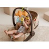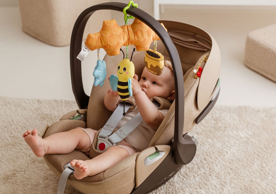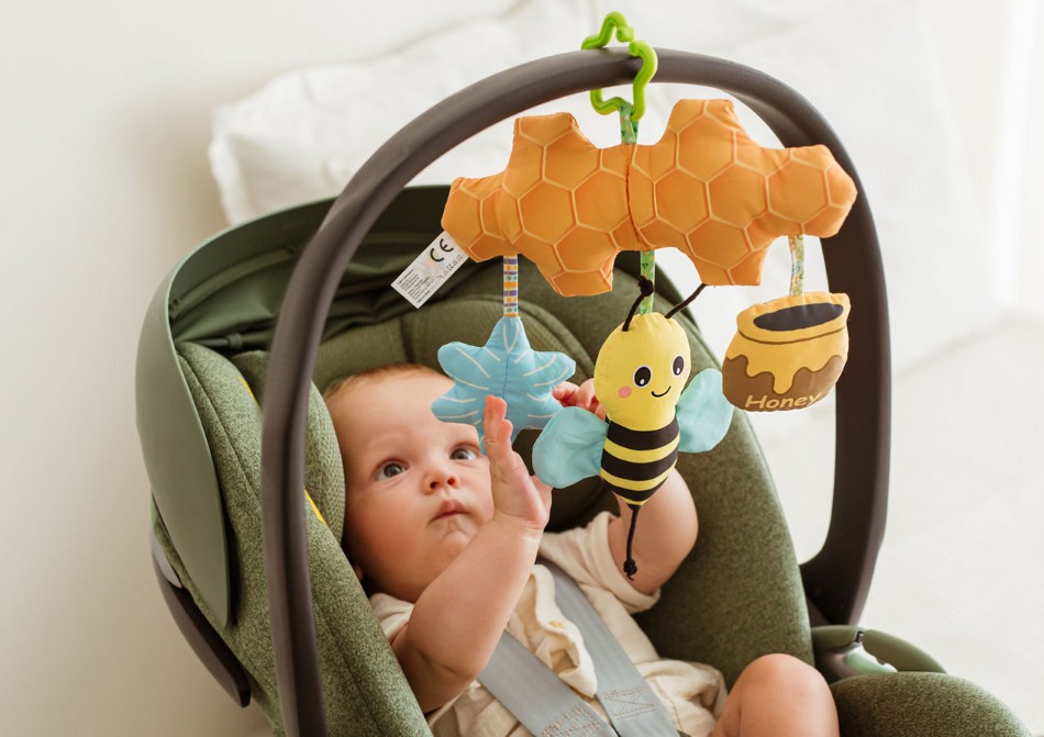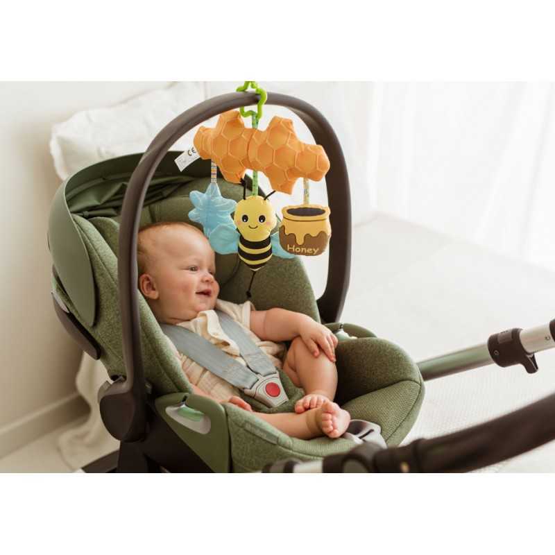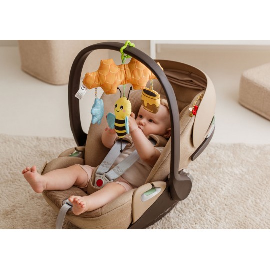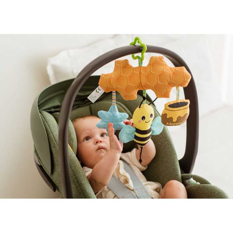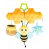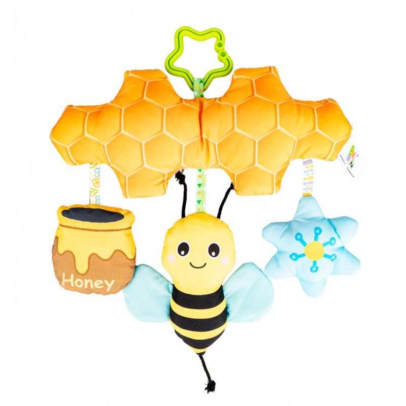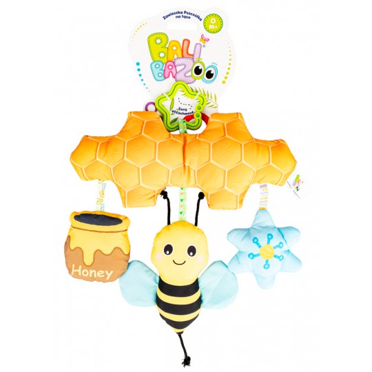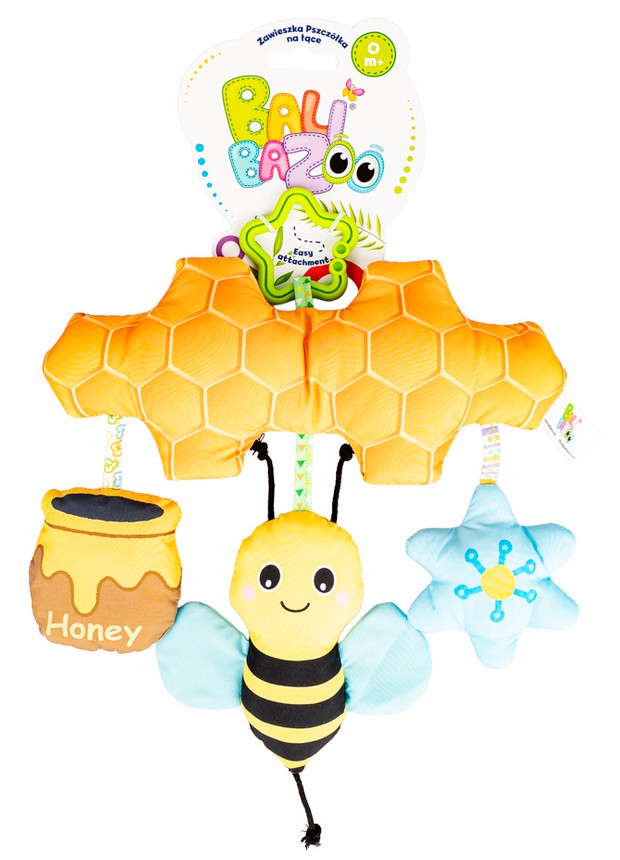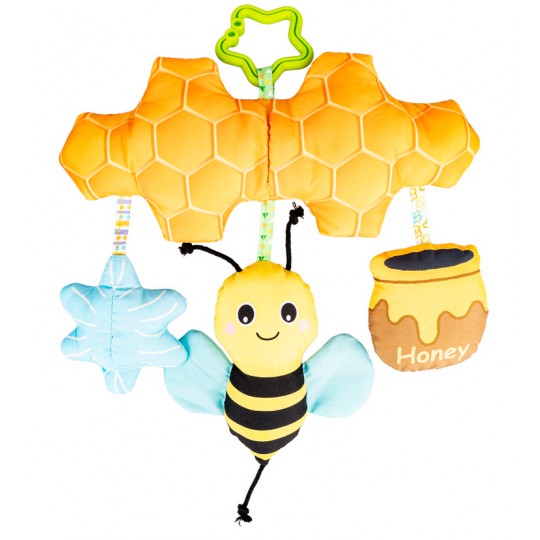 Wesoła zawieszka bawi, kryjąc w sobie wiele niespodzianek! Na plastrze miodu, wyposażonym w kryty dzwoneczek, buja się, zabawnie popiskując, uśmiechnięta pszczółka. Towarzyszy jej szeleszcząca beczułka miodu i piszczący kwiatek. Zabawka posiada praktyczną zawieszkę w kształcie gwiazdki, która umożliwia przymocowanie jej w dowolnym miejscu. Produkt przeznaczony jest dla dzieci od dnia narodzin.