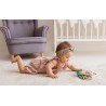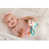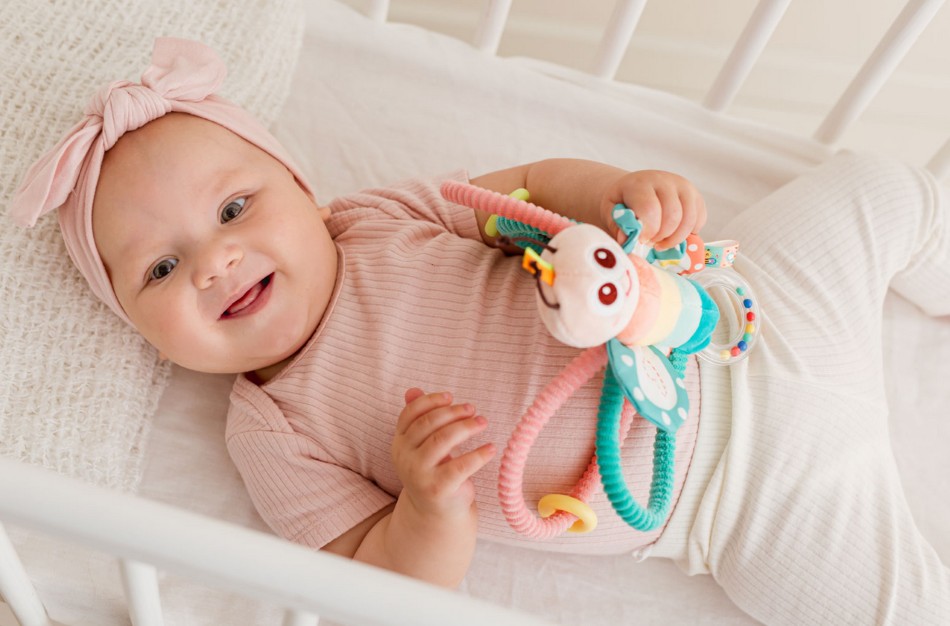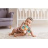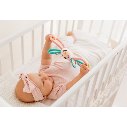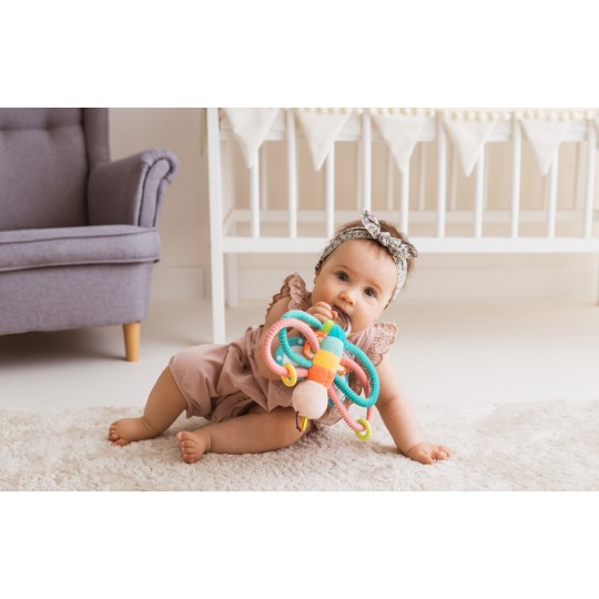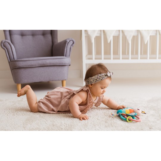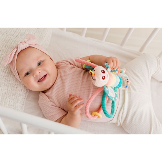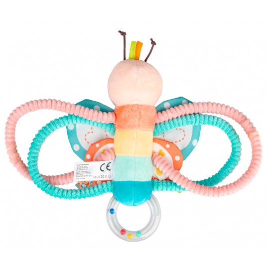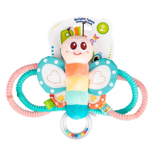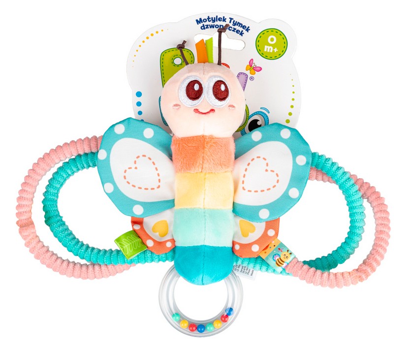 Tymek, szeleszcząc wesoło, zaprasza do sensorycznej zabawy! Kolorowy motylek wyposażony został w ukryty dzwoneczek, który wydaje uroczy dźwięk przy każdym potrząśnięciu zabawką. Kolorowe, fakturowane obręcze, które zdobią Tymka są elastyczne i dostosowane do małych rączek, co ułatwia najmłodszym chwytanie zabawki. Jakby tego było mało, Motylek posiada także grzechoczący element, a jest nim przezroczysty krążek, wypełniony koralikami. Zabawka uszyta została z materiałów o zróżnicowanych fakturach, co pozwala rozwijać zdolności poznawcze malucha, zachęcając go do odkrywania świata za pomocą zmysłów.Produkt przeznaczony jest dla dzieci od dnia narodzin.