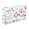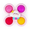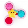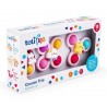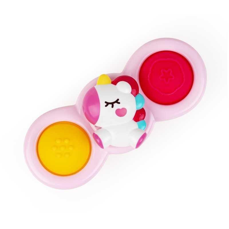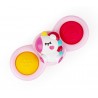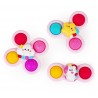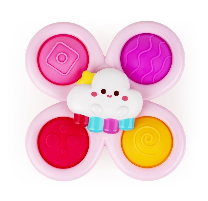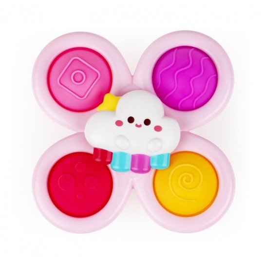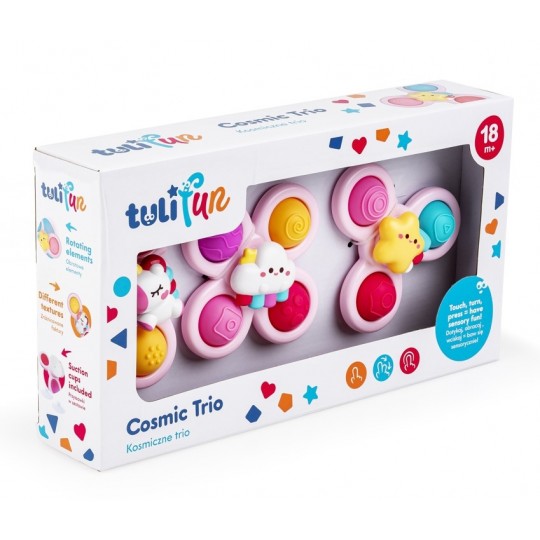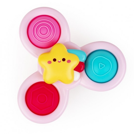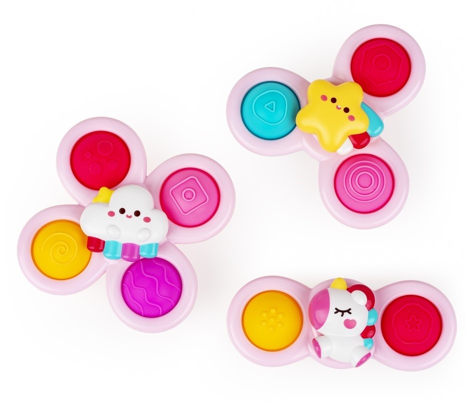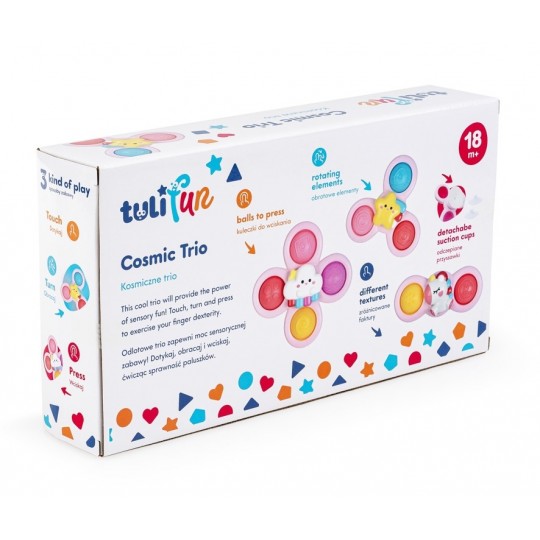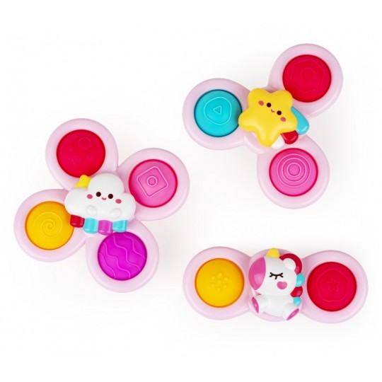 Kręć i wciskaj, gdzie tylko zechcesz! Zestaw trzech uroczych zabaweczek dostarczy wesołej rozrywki w dowolnym miejscu. Każda z zabaweczek posiada kolejno dwa, trzy lub cztery kolorowe pola do wciskania, z wytłoczonymi kształtami. Zabawa polega na przepchnięciu kuleczek na drugą stronę zabawki, a następnie wypchnięciu ich z powrotem do góry. W zestawie znajdują się praktyczne przyssawki, dzięki którym bez trudu przymocujesz zabawkę do dowolnej czystej i gładkiej powierzchni. Po przymocowaniu, można kręcić nią za pomocą paluszka. Produkt przeznaczony jest dla dzieci od 18 miesiąca życia.