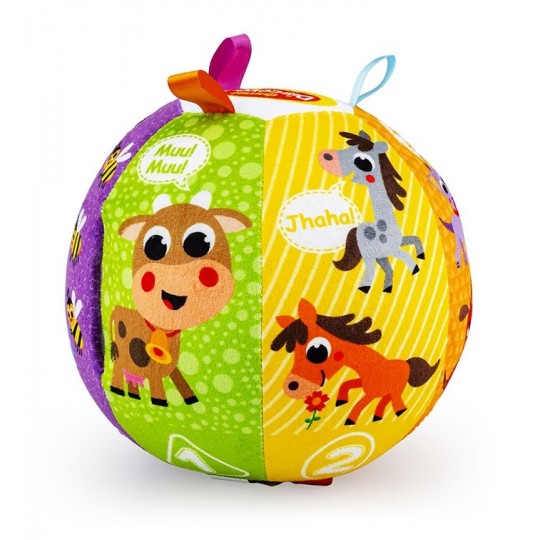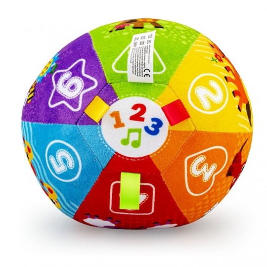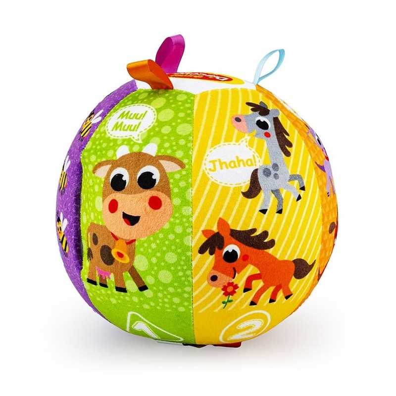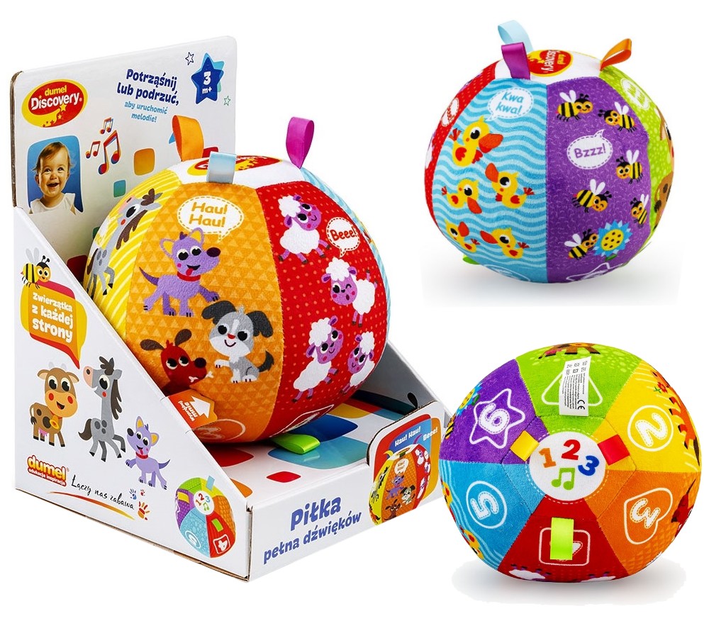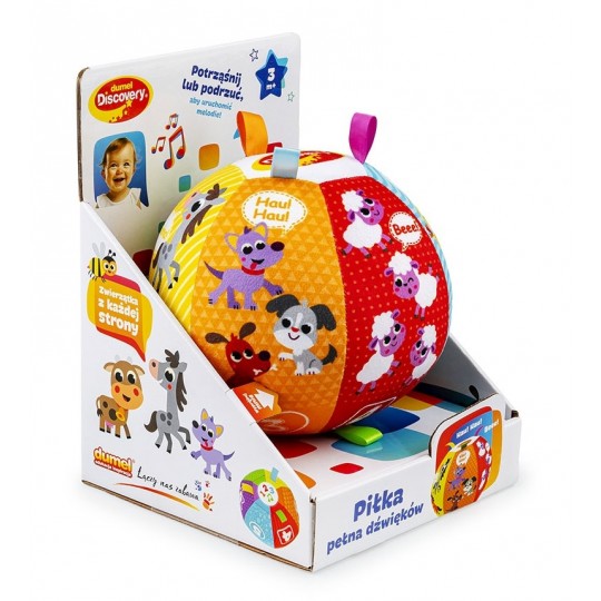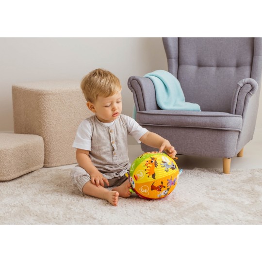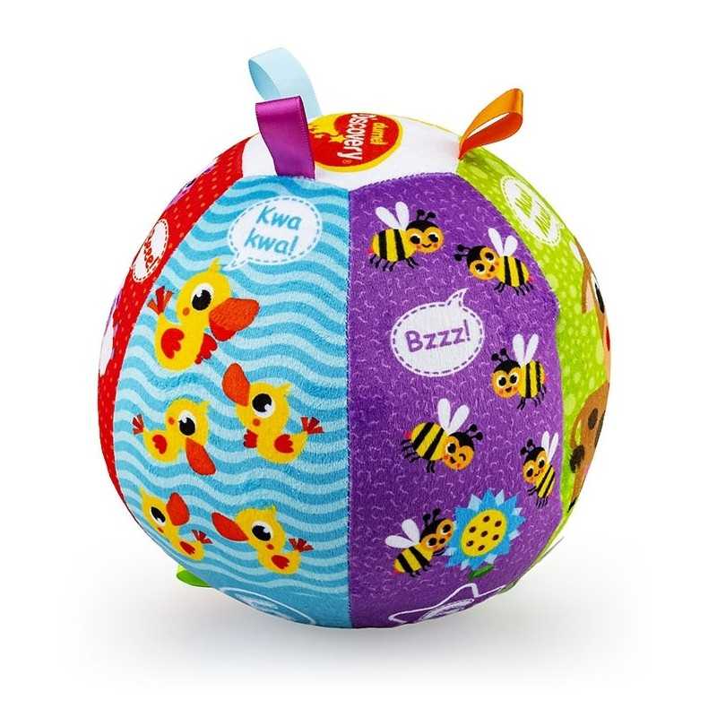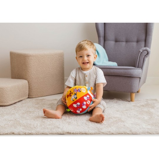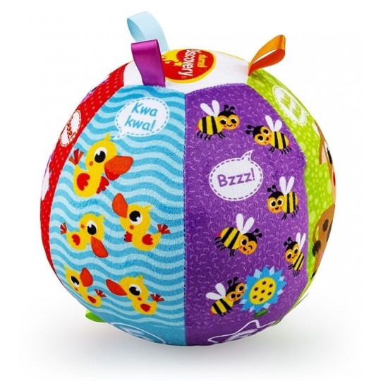 Potrząśnij i posłuchaj! W tej kolorowej piłeczce pochowały się urocze melodie pełne zwierzakowych odgłosów! Milusia zabawka posiada materiałowe metki i mnóstwo obrazków przedstawiających zwierzątka, cyferki i kształty. Aby aktywować melodie, wystarczy podrzucić piłeczkę, a z jej wnętrza popłyną miłe dla ucha dźwięki. Zapięcie na rzep zapewnia wygodny dostęp do mechanizmu, w celu wymiany baterii lub wyjęcia mechanizmu do wyprania zabawki. Produkt przeznaczony jest dla dzieci od 3 miesiąca życia.