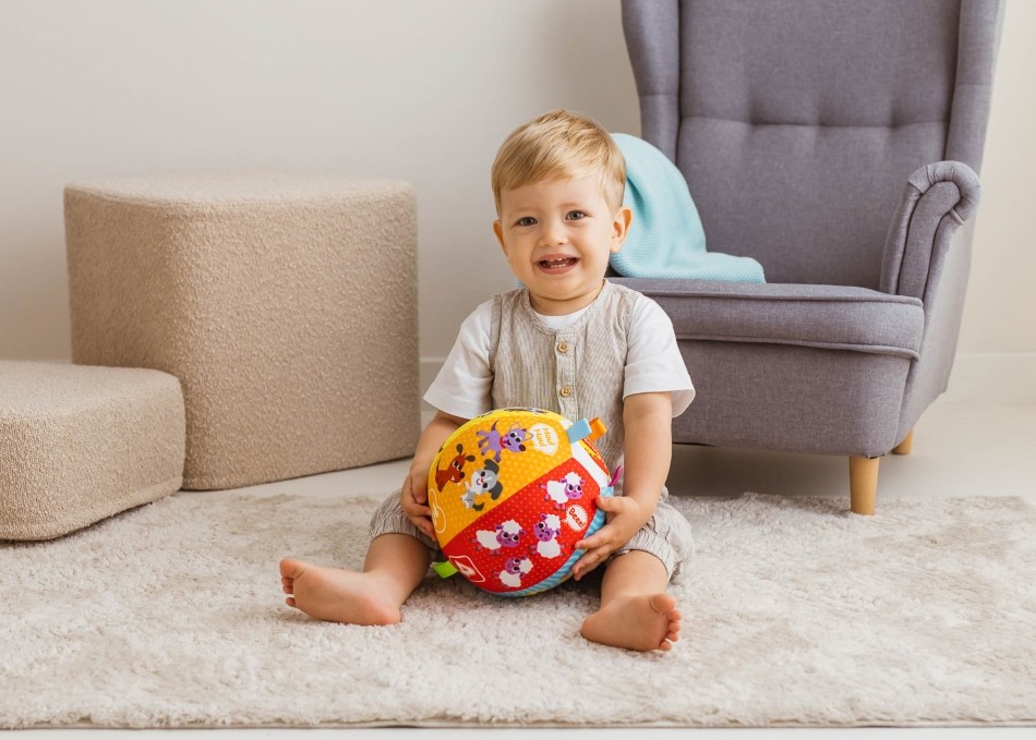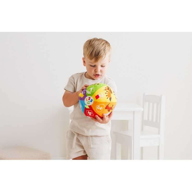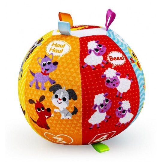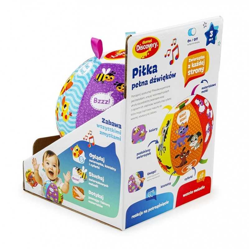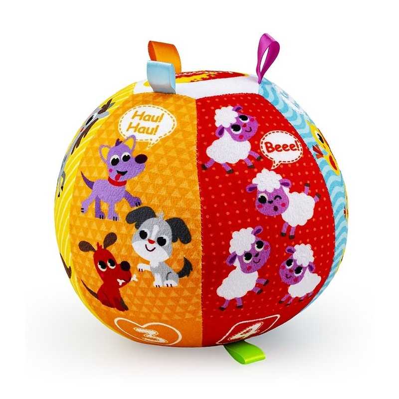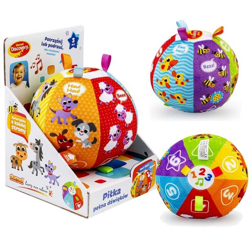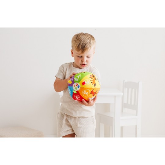 Potrząśnij i posłuchaj! W tej kolorowej piłeczce pochowały się urocze melodie pełne zwierzakowych odgłosów! Milusia zabawka posiada materiałowe metki i mnóstwo obrazków przedstawiających zwierzątka, cyferki i kształty. Aby aktywować melodie, wystarczy podrzucić piłeczkę, a z jej wnętrza popłyną miłe dla ucha dźwięki. Zapięcie na rzep zapewnia wygodny dostęp do mechanizmu, w celu wymiany baterii lub wyjęcia mechanizmu do wyprania zabawki. Produkt przeznaczony jest dla dzieci od 3 miesiąca życia.