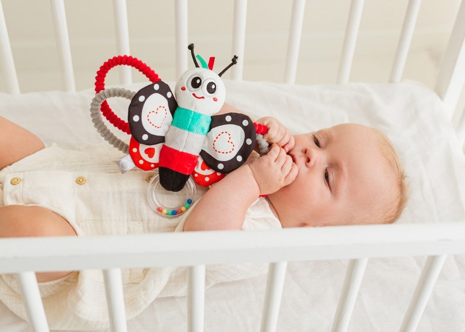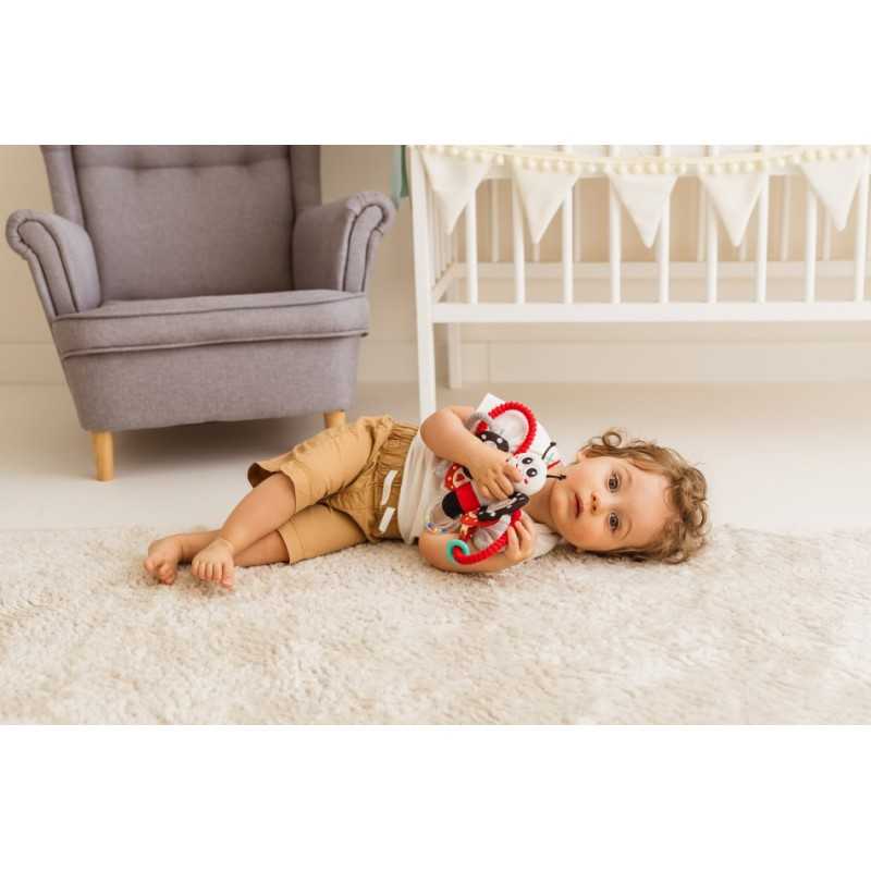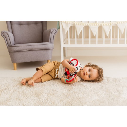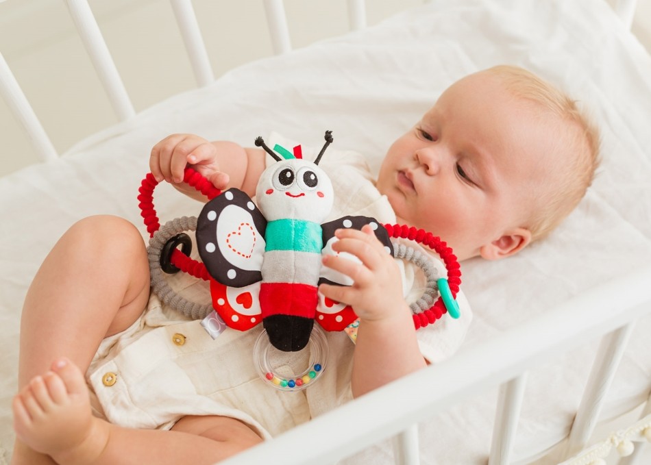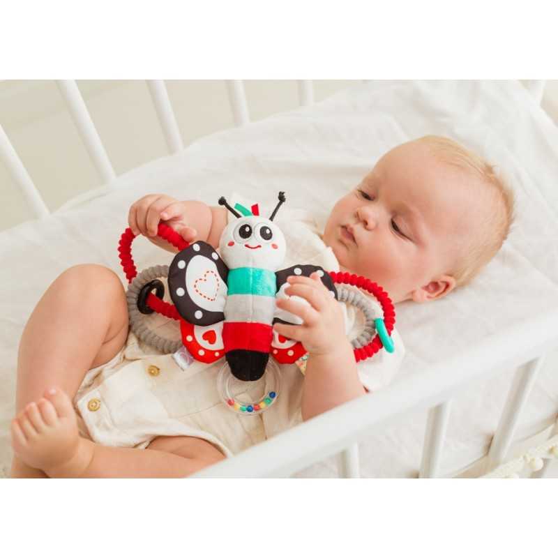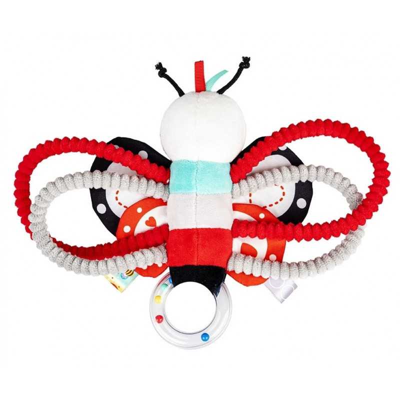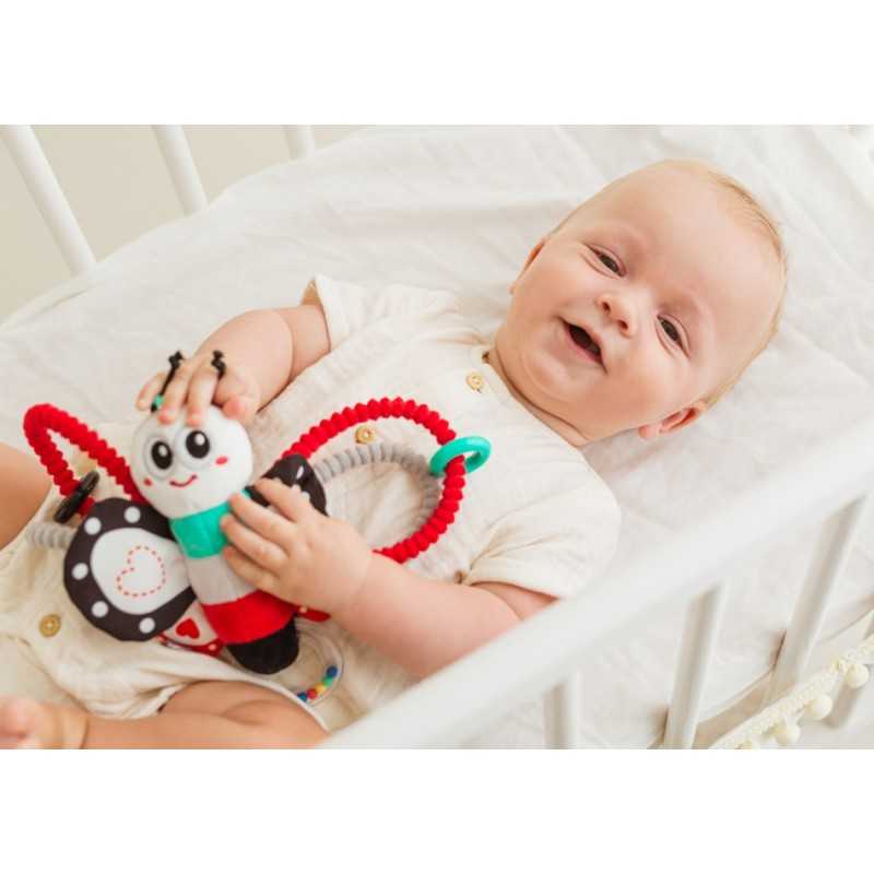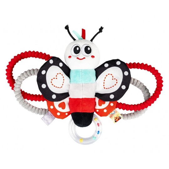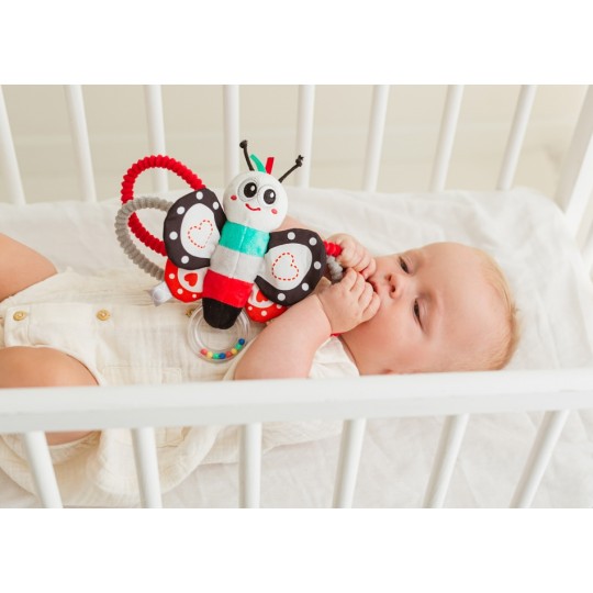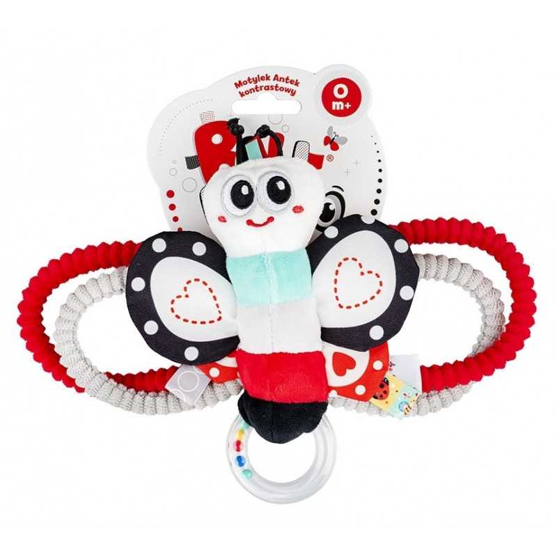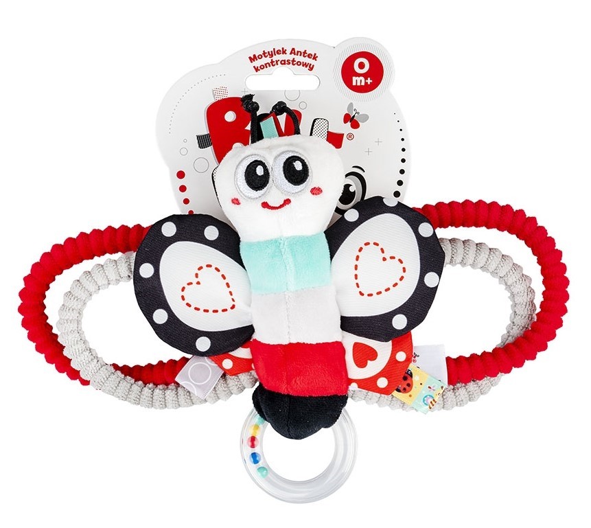 Pierwszy przyjaciel dzidziusia, który nie tylko uroczo wygląda, ale posiada też bogate wnętrze! Ten uśmiechnięty motylek uszyty został z kontrastowych materiałów różniących się fakturą, co wpływa korzystnie na rozwój zdolności poznawczych dziecka, zachęcając go przy tym do poznawania świata za pomocą zmysłów. Antkowe skrzydełka zabawnie szeleszczą podczas dotykania, a ukryty wewnątrz zabawki dzwoneczek, wydaje wesoły odgłos przy każdym potrząśnięciu. Skrzydełka motylka okalają elastyczne, fakturowane obręcze, które ułatwią maluchowi chwytanie zabawki. Produkt przeznaczony jest dla dzieci od dnia narodzin.