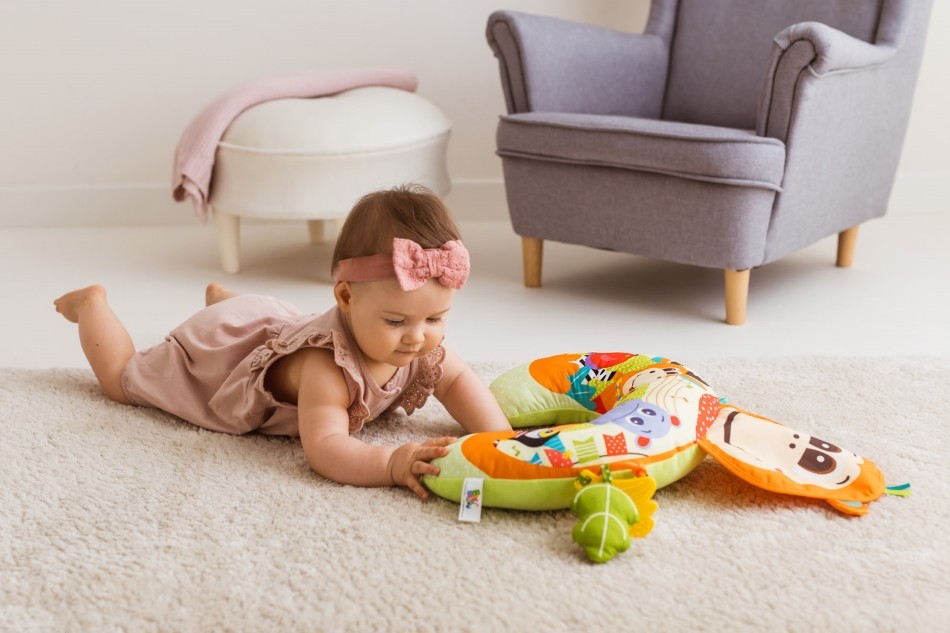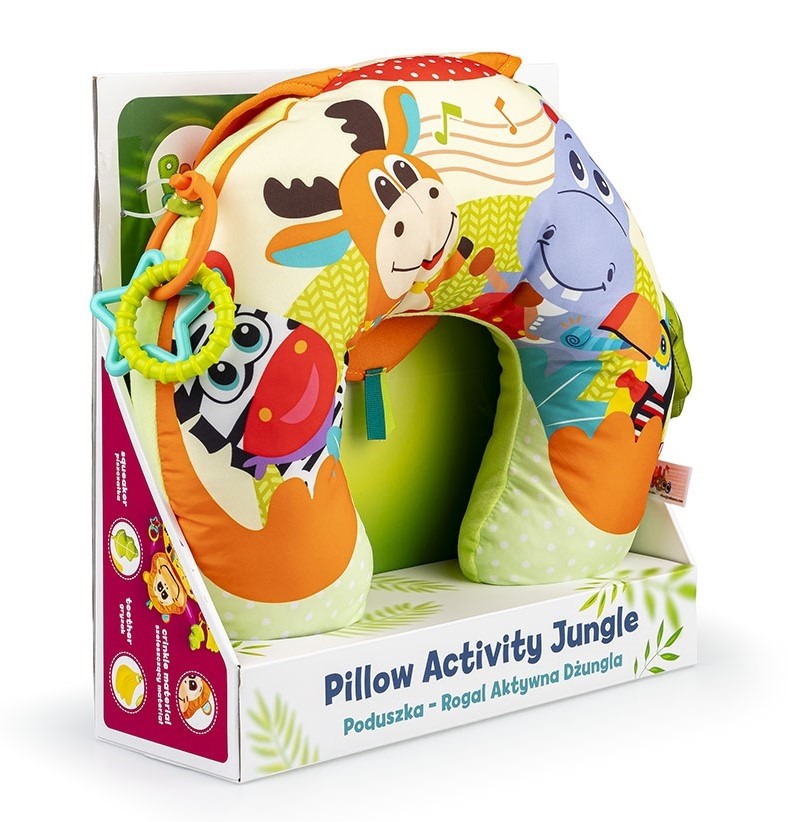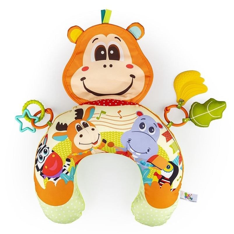 Kolorowa podusia zapewni wsparcie maluszkowi leżącemu na brzuchu i zabawi go wesołymi obrazkami zwierzaczków! Poduszka wykonana została z materiałów różniących się kolorem, nadrukiem, a także fakturą, co pozwoli rozwijać zdolności poznawcze dziecka. Doszyta małpia głowa zabawnie szeleści przy dotykaniu, a przymocowane do poduszki zabawki zapewnią małym rączkom dodatkowe zajęcie. Na jednym z odczepianych kółeczek znajdziemy twarde kształty, a na drugim – piszczałkę w kształcie listka i miękki gryzak w kształcie kiści bananów. Produkt przeznaczony jest dla dzieci od dnia narodzin.