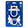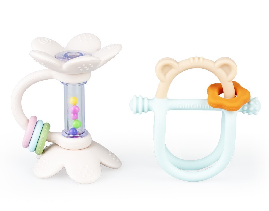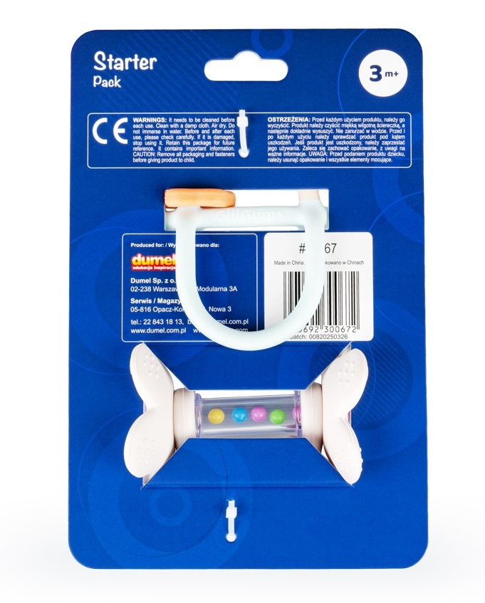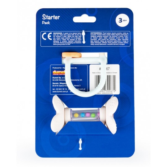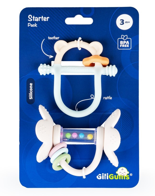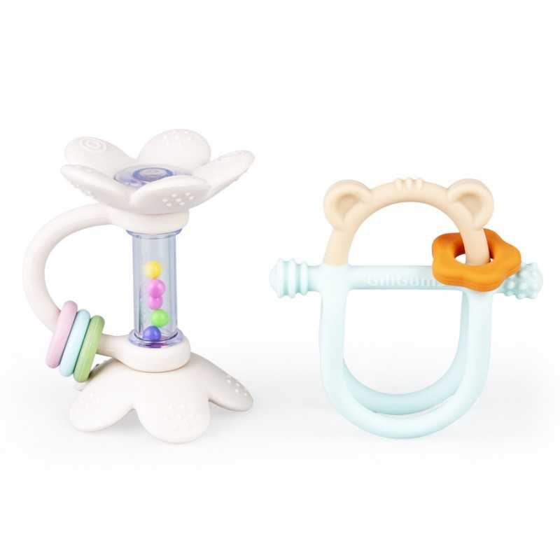 Dwupak na start, który zabawi i przyniesie ulgę podczas ząbkowania! Ten uroczy zestaw składa się z dwóch przydatnych produktów: gryzaczka, którego konstrukcja ułatwia chwytanie zabawki małymi rączkami oraz grzechotki wyposażonej w ruchome pierścienie. Obie zabawki posiadają wypustki, które podczas gryzienia delikatnie masują podrażnione ząbkowanie dziąsełka bobasa. Zestaw wspaniale sprawdzi się w charakterze prezentu dla maluszka. Produkt przeznaczony jest dla dzieci od 3 miesiąca życia.