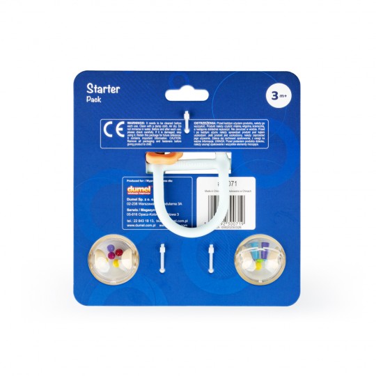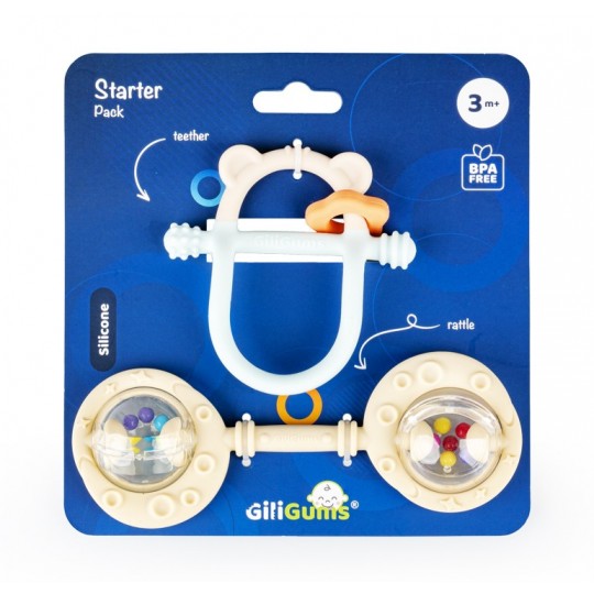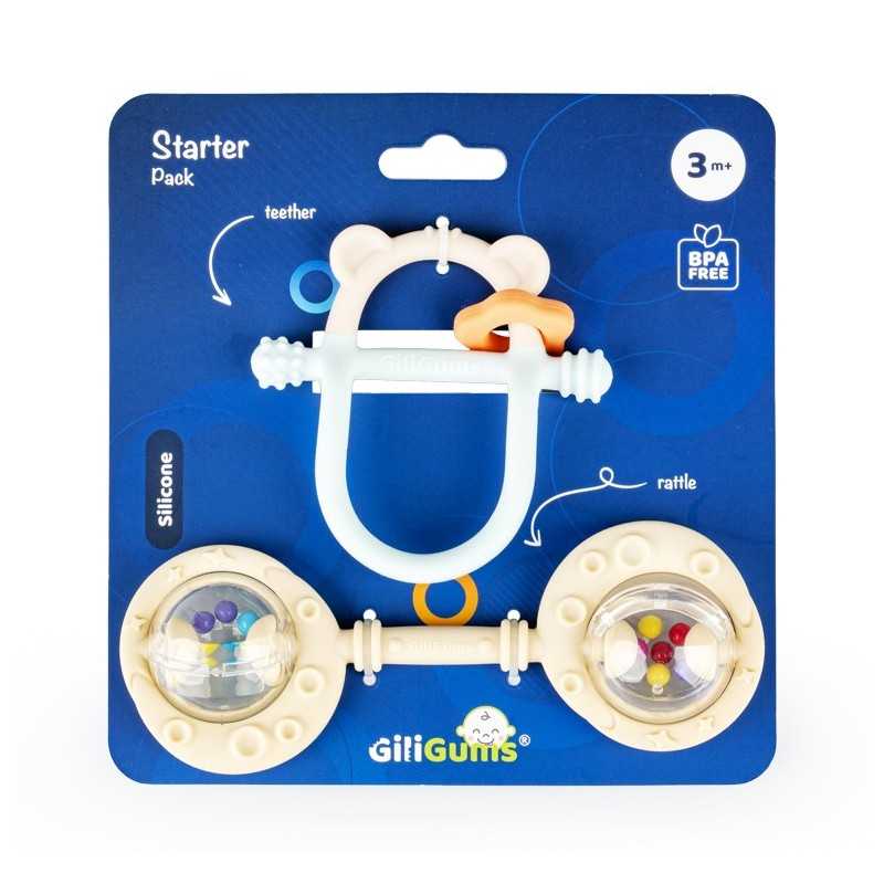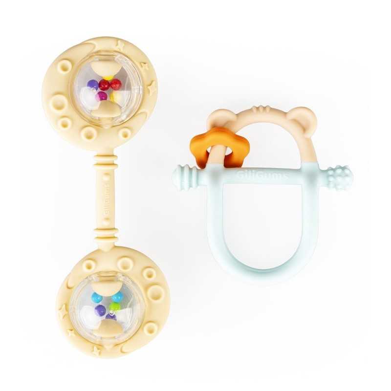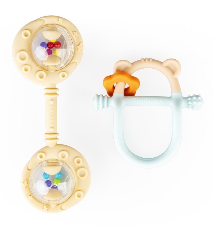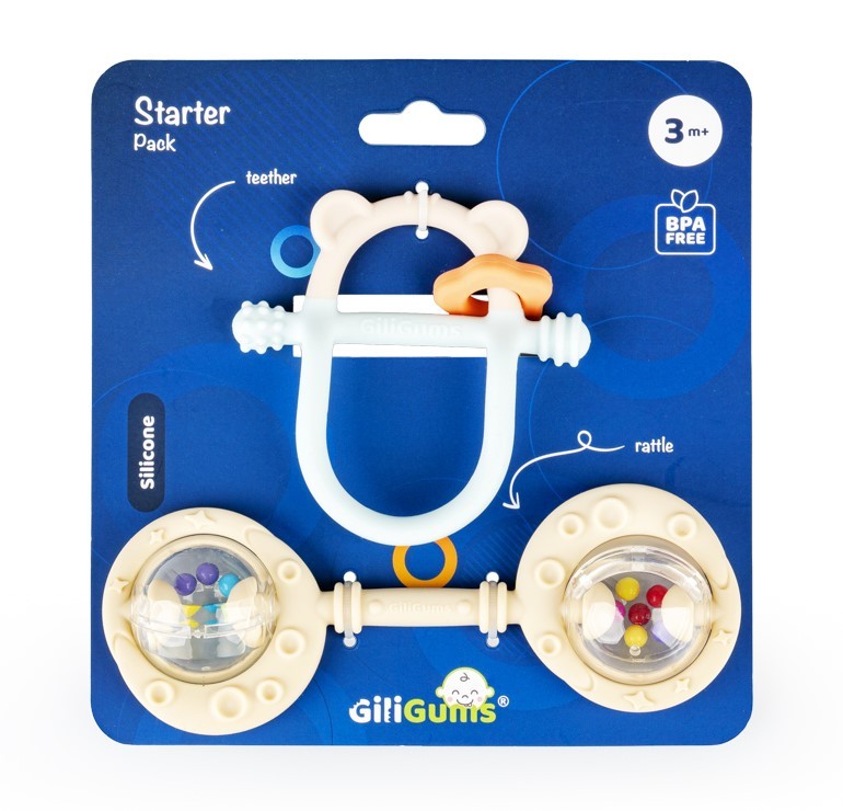 Dwupak łączy w sobie walory praktyczne i estetyczne, bawiąc oraz przynosząc ulgę w ząbkowaniu! W zestawie znajdziemy gryzak Miś oraz Podwójną Grzechotkę w kolorze beżowym. Obie zabawki posiadają wypustki, które podczas gryzienia będą delikatnie masować dziąsła ząbkującego bobasa. Kształt gryzaczka oraz grzechotki dopasowany jest do małych rączek, co umili maluchowi korzystanie z nich. Ten praktyczny zestaw świetnie sprawdzi się w charakterze prezentu. Produkt przeznaczony jest dla dzieci od 3 miesiąca życia.