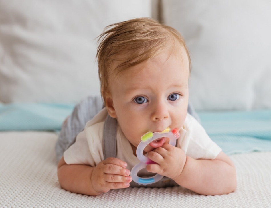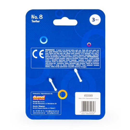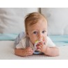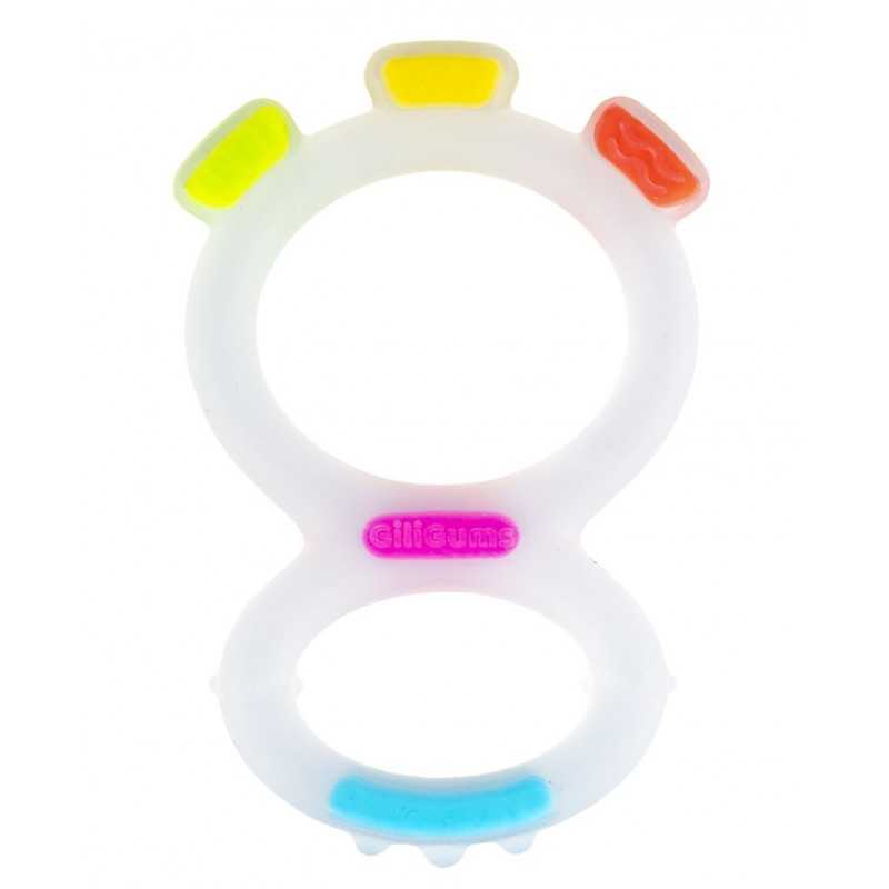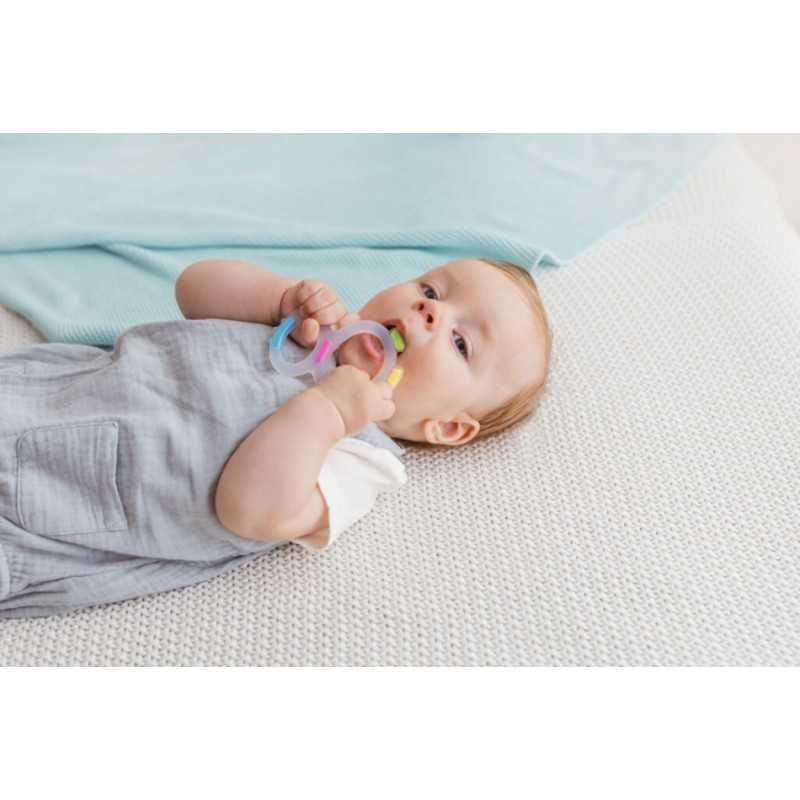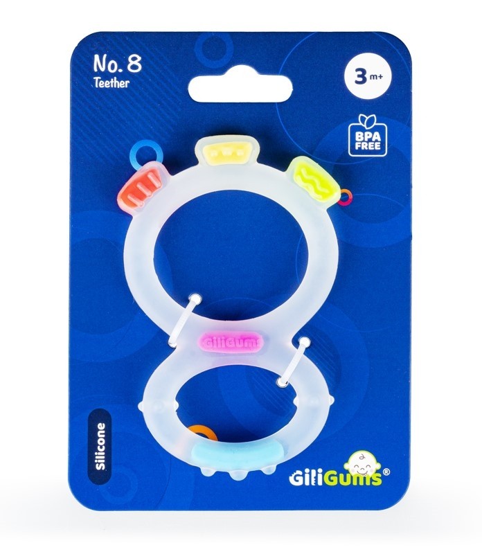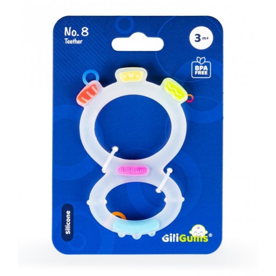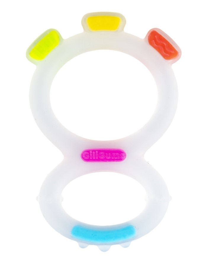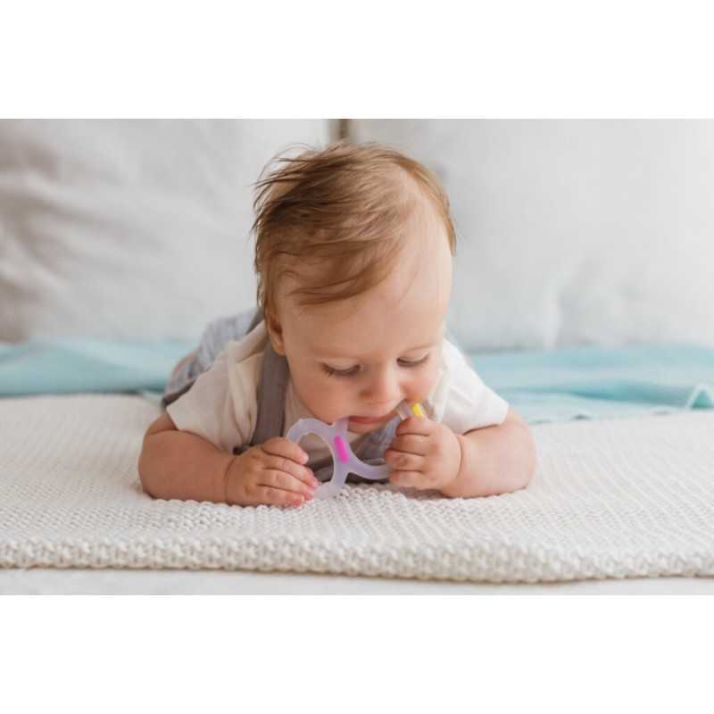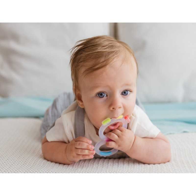 Dwa brzuszki ozdobione wypustkami przyniosą ulgę w ząbkowaniu! Ten zabawny gryzaczek wykonany został z silikonu, dzięki czemu bez trudu go wyczyścisz, aby zapewnić maluszkowi higienę, podczas korzystania z zabawki. Kształt Ósemki dopasowany jest do małych rączek, co ułatwi maluchowi chwytanie gryzaka. Produkt przeznaczony jest dla dzieci od 3 miesiąca życia.