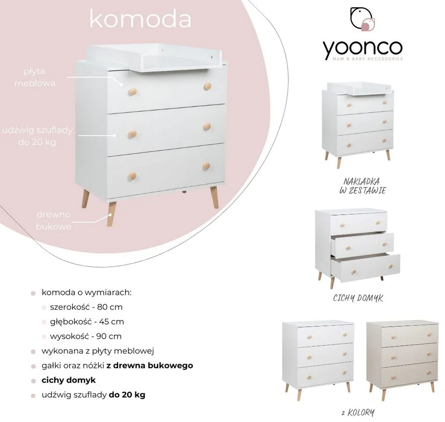 Komoda yoonco z przewijakiem to mebel, który spełni potrzeby zarówno rodziców, jak i dzieci. Dzięki połączeniu minimalistycznego designu, wysokiej jakości wykonania i funkcjonalności, idealnie sprawdzi się jako komoda do pokoju dziecka, oferując wygodne miejsce do przechowywania ubranek, kosmetyków i akcesoriów pielęgnacyjnych.