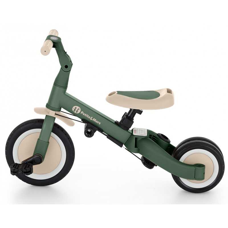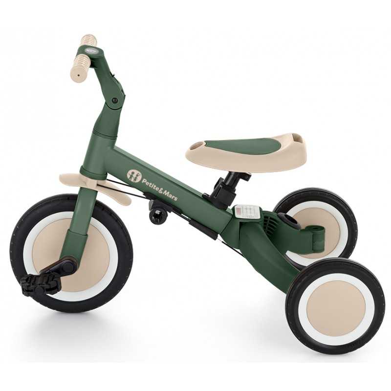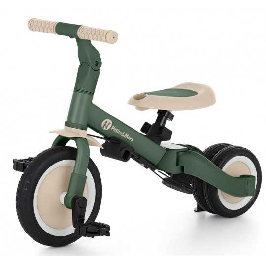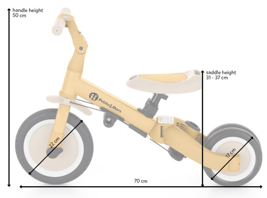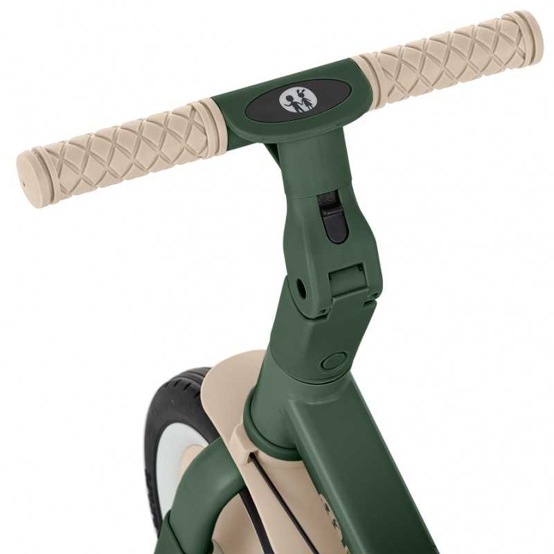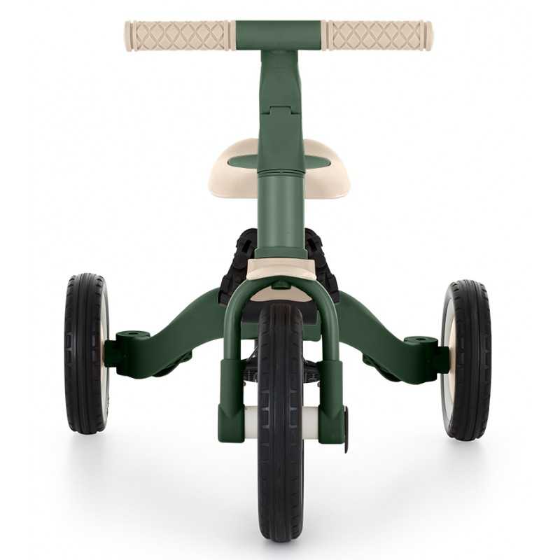 Kierownica z antypoślizgowymi gumowymi uchwytami jest regulowana, pedały można zdejmować, a siodełko dopasowuje się do wzrostu, zapewniając jednocześnie maksimum bezpieczeństwa dzięki dokładanym pasom bezpieczeństwa. Wytrzymałe koła, sprawiają, że rowerek doskonale sprawdza się zarówno w wersji dwu- jaki i trójkołowej, gwarantując stabilność na różnych nawierzchniach. Prosty system przekształcania z jednego trybu na kolejny nie wymaga narzędzi, umożliwia szybką adaptację do wieku i umiejętności dziecka. Mimo swojej rozbudowanej funkcjonalności, pozostaje lekki i praktyczny, ważąc zaledwie 5,6 kilograma i mając kompaktowe wymiary: 67 cm długości, 46 cm szerokości w wersji trójkołowej oraz regulowaną wysokość siodełka od 31 do 37 cm.