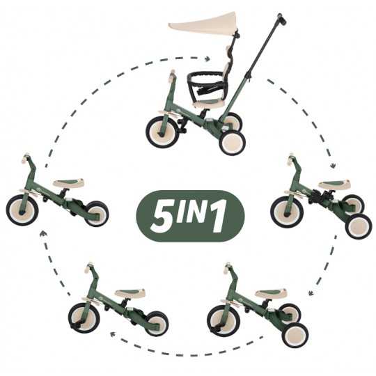 Wielofunkcyjny rowerek trójkołowy przeznaczony dla dzieci od 1,5 do 5 roku życia lub do 25 kilogramów. To nie tylko pojazd, służący do przemieszczania się i do nauki balansowania, ale także towarzysz rosnącego dziecka podczas wielu etapów rozwoju. Przemyślana transformacja rowerka dopasowuje się do potrzeb malucha w miarę wzrostu jego zdolności motorycznych. Początkowo to rowerek trójkołowy z możliwością asystowania przez rodzica, natomiast końcowa wersja to standardowy rowerek z pedałami, bez żadnych dodatkowych wspierających elementów. Dzięki takim zmianom w produkcie można wspomóc dziecko w etapach nauki jazdy na dwóch kołach. Turbo Plus to ulepszona wersja popularnego modelu Turbo – wyposażona w praktyczną budkę, która chroni dziecko przed słońcem i zwiększa komfort jazdy w cieplejsze dni. Wyjątkową cechą rowerka jest jego wielofunkcyjność, pozwalająca korzystać z niego aż w pięciu różnych trybach zależnie od wieku i umiejętności dziecka: 1.Tryb roweru trójkołowego z możliwością pchania – dla wieku 1,5 – 2 lata, 2.Tryb roweru trójkołowego jeździka – dla wieku 1,5 – 2 lata, 3. Tryb roweru trójkołowego z pedałami – dla wieku 2 – 3 lata, 4. Tryb roweru biegowego – dla wieku 3 - 4 lata, 5. Tryb roweru z pedałami – dla wieku 4 - 5 lat.