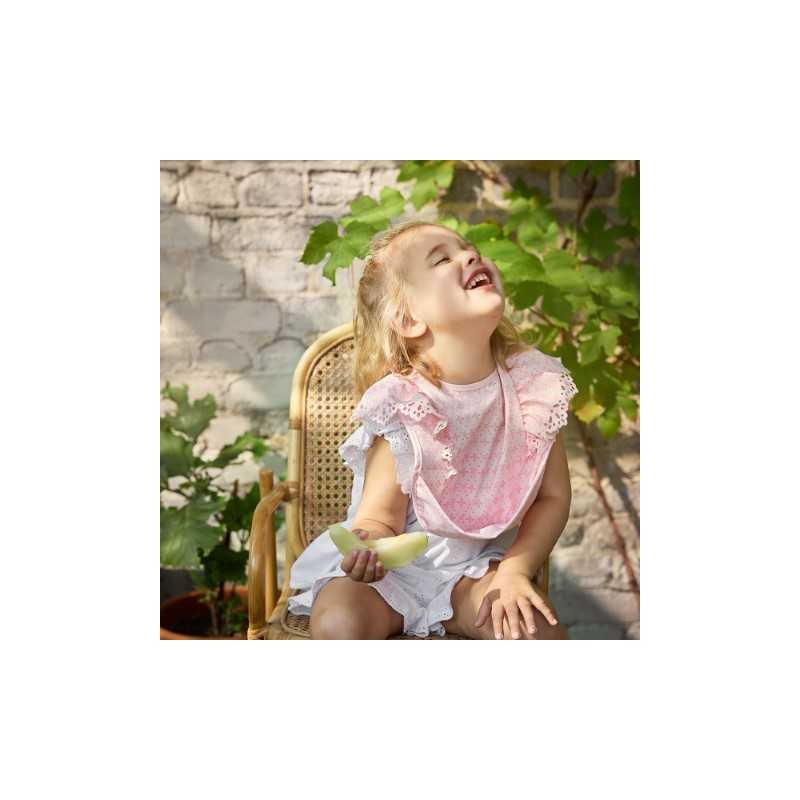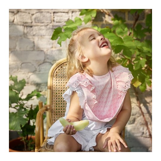 - Unikalny haft angielski i piękny odcień różu sprawiają, że śliniak jest nie tylko praktyczny, ale również stanowi modny dodatek, który wyróżni Twoje dziecko.