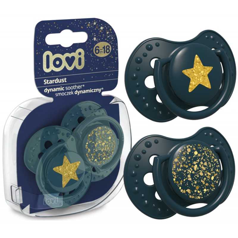 Dynamiczny smoczek uspokajający LOVI został stworzony we współpracy z neurologopedami. Ma unikalną budowę z niejednorodnego silikonu i symetryczny kształt inspirowany brodawką sutkową. Nie zaburza odruchu ssania i naturalnego rozwoju mowy i zgryzu*. Wyjątkowy design i kolorystyka smoczka podkreśla unikalność kolekcji Stardust.