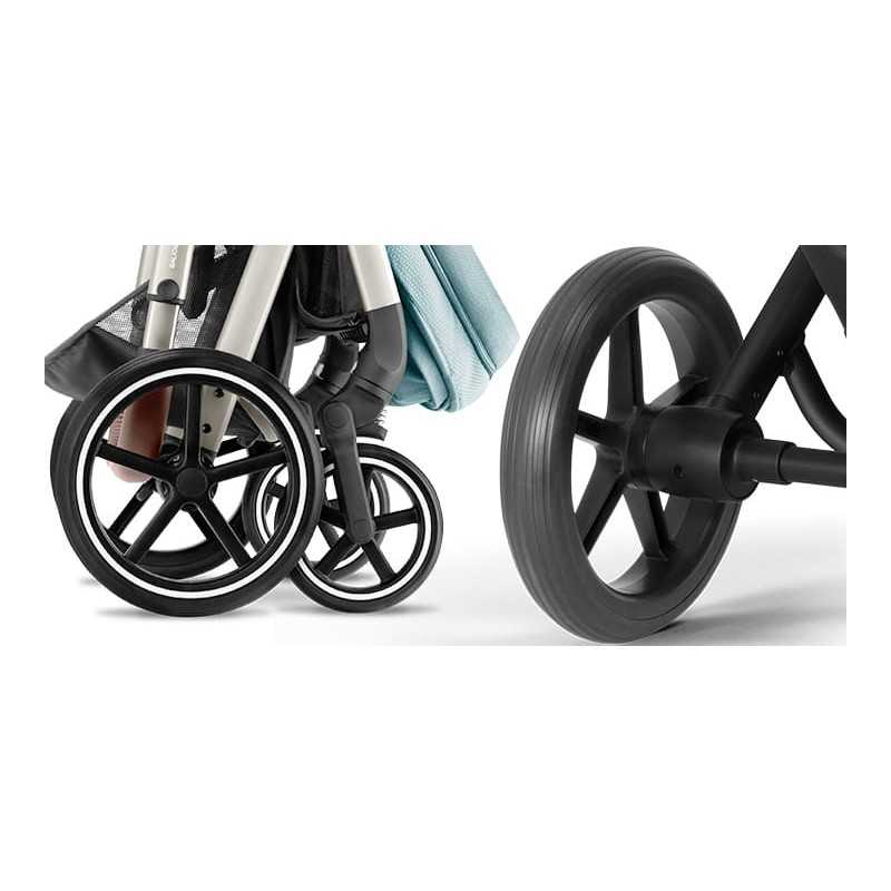 Duże, bezobsługowe koła świetnie radzą sobie w każdym terenie. Wózek ze względu na design doskonale prezentuje się w miejskim szyku, jednak koła i amortyzacja pozwalają wykorzystać wózek w trudniejszych warunkach.