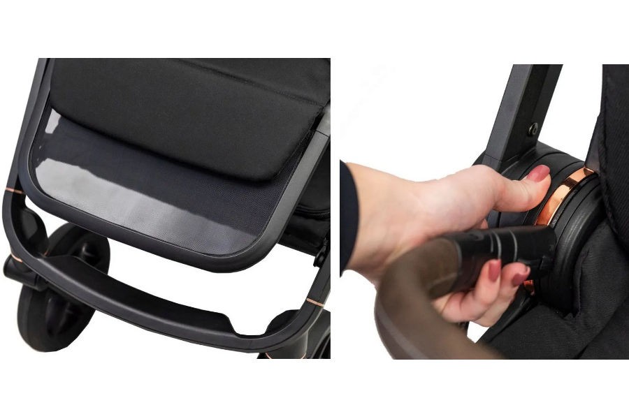 pojemny kosz na dole stelaża, który przyda się zarówno na zakupach, jak i podczas wyjścia na plac zabaw czy piknik z maluchem, małą, zapinaną na zamek kieszonkę z tyłu oparcia, do której włożysz telefon, klucze, portfel i inne drobiazgi, tapicerkę wykonaną z tkanin z filtrem przeciwsłonecznym UV50+ i o zwiększonej wodoodporności.