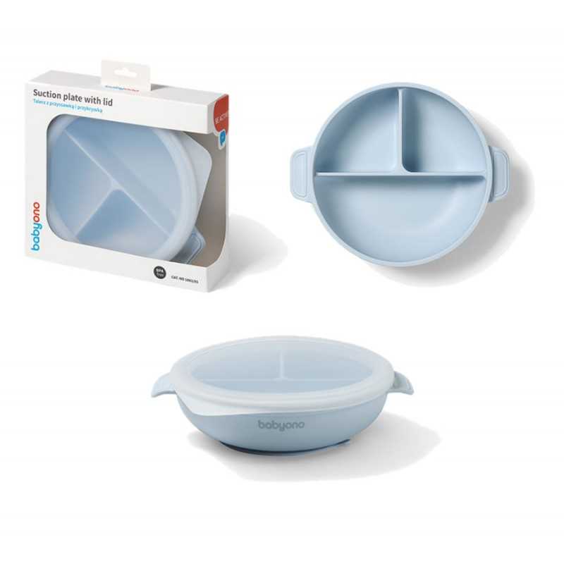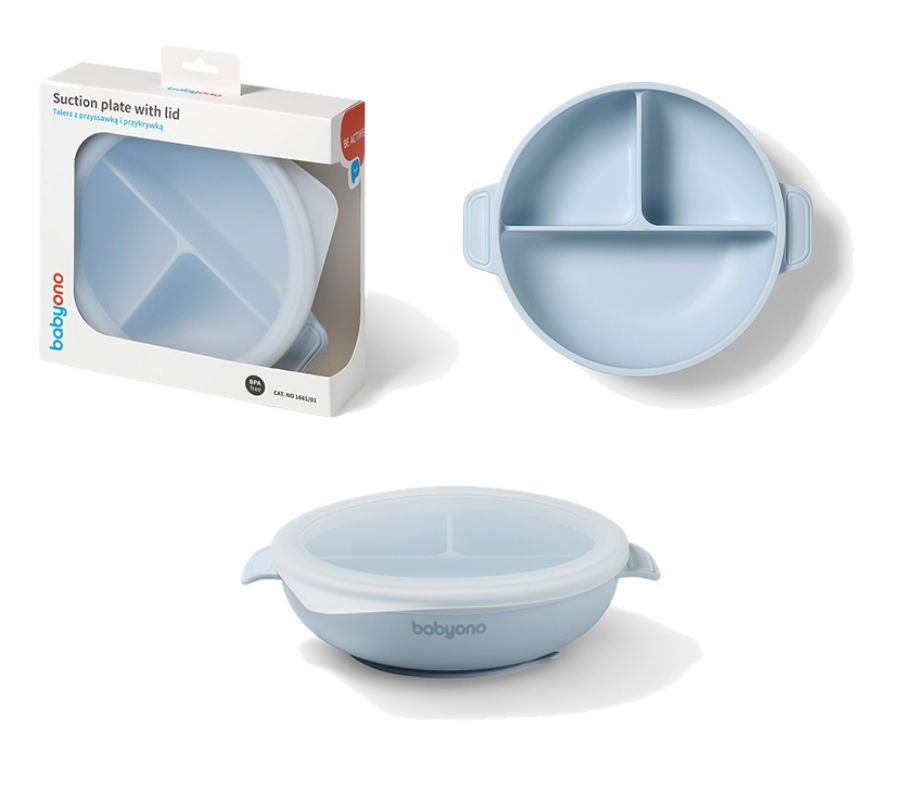 Trójdzielny talerz z przyssawką i przykrywką Babyono to Twój pomocnik przy rozszerzaniu diety maluszka, zwłaszcza metodą. Wprowadza nowe smaki, wspiera samodzielne jedzenie i ogranicza bałagan.Mocna przyssawka trzyma silikonowy talerz na swoim miejscu, a zaokrąglony kształt ułatwia nabieranie pokarmu. Trzy przegródki pozwalają rozdzielić składniki, by dziecko mogło próbować każdego smakołyku osobno.Pokrywka utrzymuje ciepło i świeżość posiłków, a antypoślizgowe uchwyty umożliwiają wygodne przenoszenie naczynia. Talerzyk z podziałką i pokrywkę wykonaliśmy z bezpiecznego i trwałego silikonu. Możesz bez obaw podgrzewać je w mikrofalówce i myć w zmywarce.