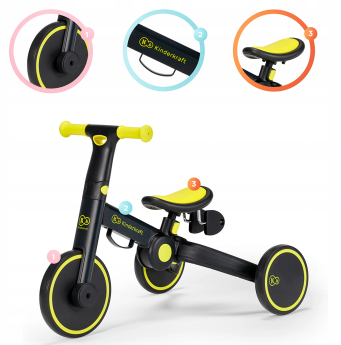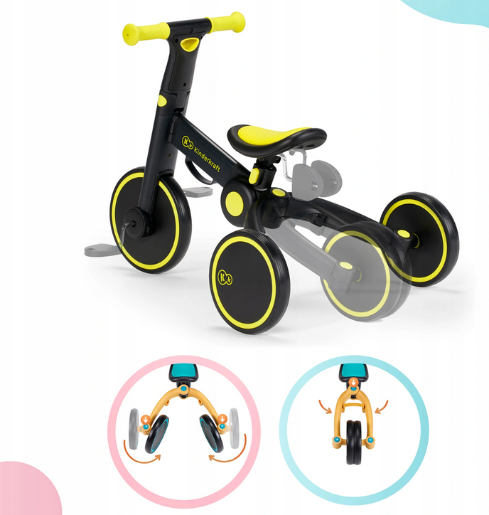 Rowerek 4TRIKE łączy w sobie aż 3 funkcje: minirowerka-pchacza (jeździka dla dzieci od 1 roku życia do 2 lat), minirowerka biegowego (2-4 lata), rowerka trójkołowego z pedałami (2-5,5 lat). Dzięki nowoczesnym rozwiązaniom rodzic w kilka chwil zmieni funkcje rowerka - bez konieczności używania narzędzi! Malec chce jeździć na trójkołowcu? Wystarczy kilka ruchów i gotowe.